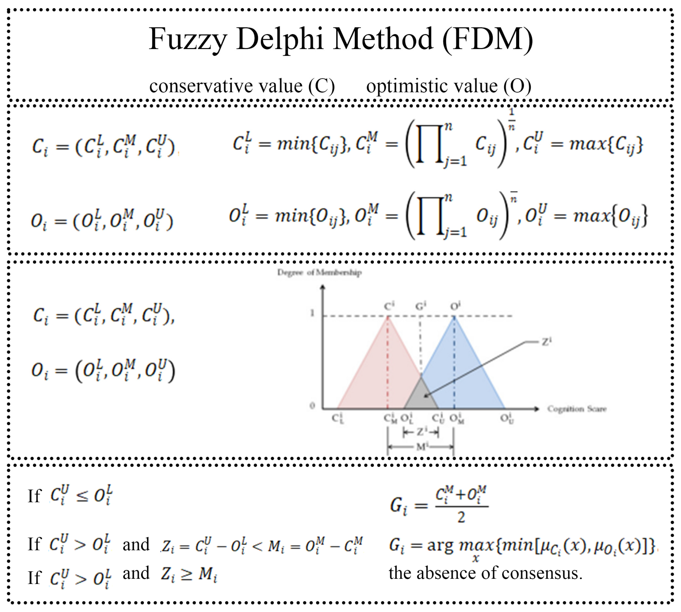55], the FDM employed in this research utilizes “dual-triangular fuzzy numbers” to integrate expert opinions and employs the “gray zone test” to examine whether these expert opinions exhibit consistent convergence [