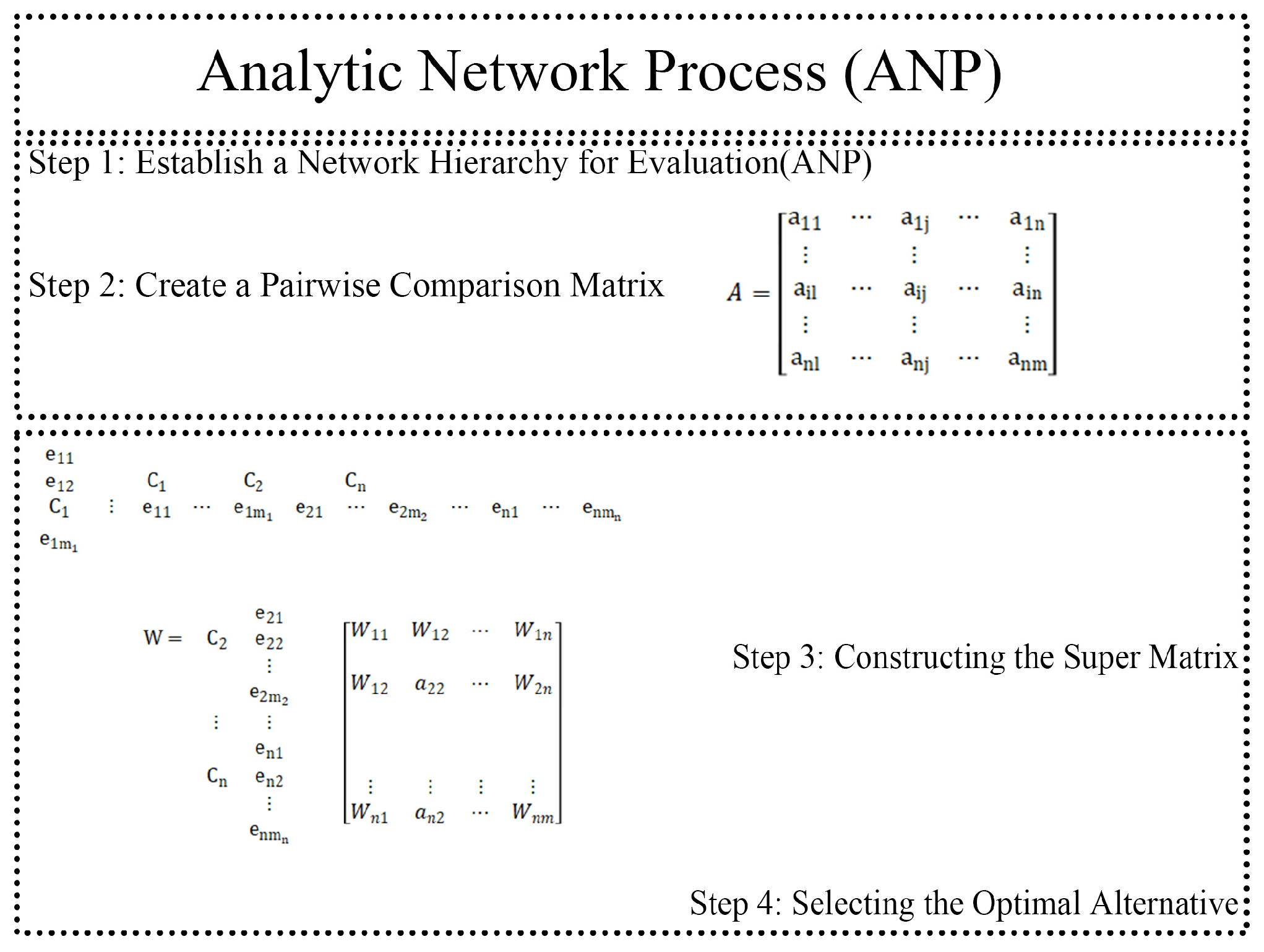 56]. Given the complex interdependencies and feedback relationships among indicators such as economic performance, community space, and cultural value in industrial heritage reuse, this study employs the Analytic Network Process (ANP) to depict the network connections between indicators and calculate their weights. This approach avoids the nonlinear coupling effects often overlooked by traditional hierarchical analysis methods, thereby more accurately reflecting the priority ranking of reuse proposals for Guangzhou Steel New City. Consequently, the Analytic Network Process (ANP) is proposed to address such challenges [