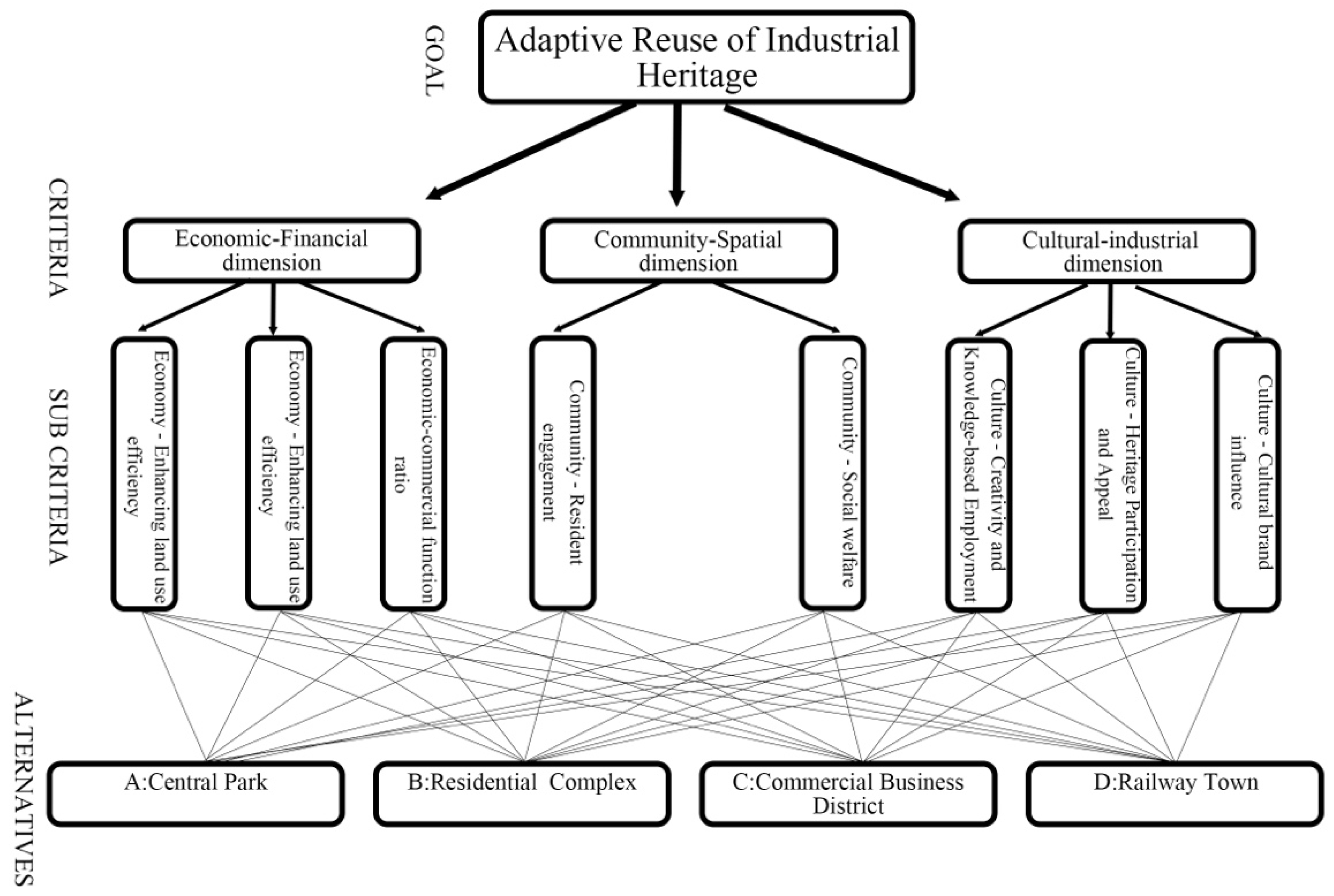 25]. Against this backdrop, decision-making bodies often place excessive emphasis on the industrial potential and economic value inherent in such heritage sites, failing to balance the conflicting interests among stakeholders. This underscores the practical necessity for a comprehensive and transparent evaluation process. Consequently, decision-making concerning the preservation and reuse of industrial heritage should be approached as a multi-criteria decision-making process [