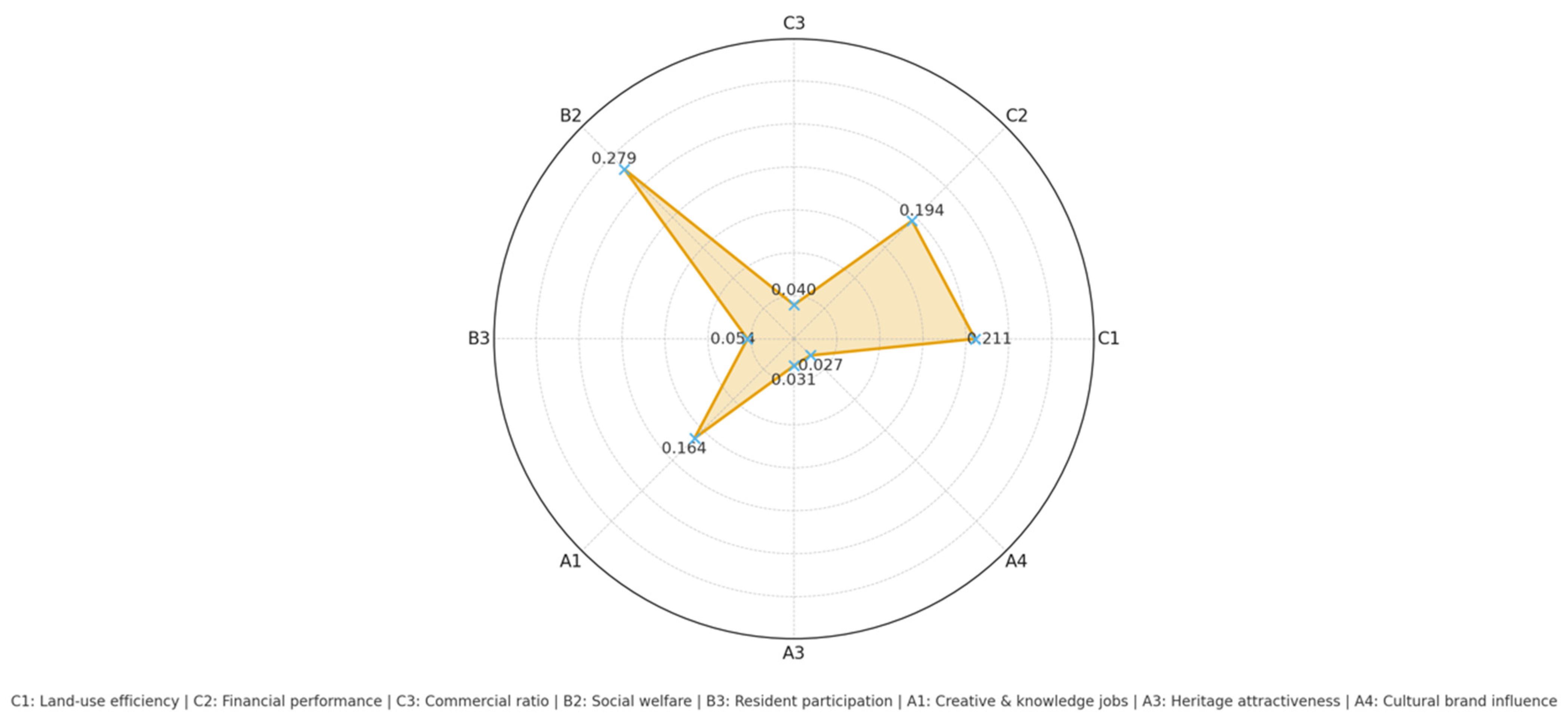 Furthermore, this “economic-cultural” tension is not only reflected in the case of Guanggang New Town, but also reveals the general contradictions in current urban renewal policies. On the one hand, economic rationality often becomes a prerequisite for project implementation and funding decisions, reinforcing the profit-oriented “economic determinism”; on the other hand, cultural sustainability requires the continuation of local characteristics, historical continuity and social identity, and emphasizes non-quantifiable long-term value. This contradiction forces urban renewal to confront the challenges of value trade-offs and rebalancing at different stages of development. This study’s multi-attribute evaluation framework is portable across regions and can achieve a dynamic balance between economic, community, and cultural dimensions across different types of post-industrial cities. By localizing the weights of indicators, the model can help cities around the world maintain a sustainable development path of cultural heritage and social inclusion while pursuing economic returns.