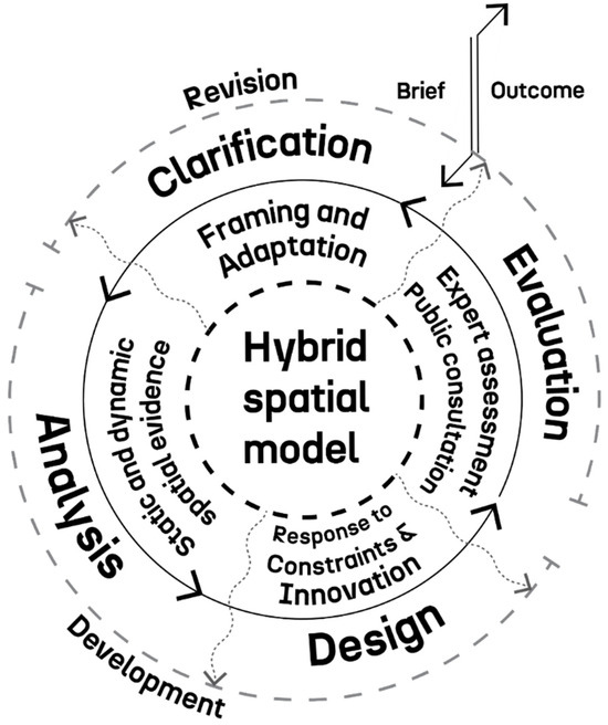 The Hybrid Spatial Model brings together diverse streams of knowledge, quantitative data and analysis, qualitative insights, disciplinary expertise, and stakeholder perspectives. These are synthesised into a unified and spatially coherent structure. Importantly, links are established between the Hybrid Spatial Model and all phases of clarification, analysis, design, and evaluation. The design process is thereby informed by the evidence base while in turn remains responsive to evaluations considering the project’s intended outcomes.