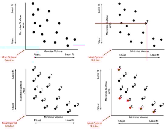 Secondly, the weighted scores for each trait were combined and ranked using the Pareto dominance method; primarily used in multi-criteria optimisation, Pareto dominance is a value that represents the optimal trade-off between two or more conflicting objectives []. Through this analysis, the highest ranked solutions comprised the Pareto Front and thus considered the highest performing images. Figure 4 is a simple graphical representation of how Pareto dominance is calculated on a problem with 2 variables.