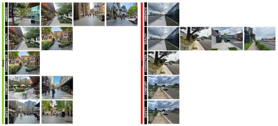 Several studies (more closely related to the research presented herein) have examined the correlations between urban conditions and their subjective perceptions. Qiu et al. [] tracked participants’ eye movements when observing images of urban green sites. Gaze fixation may reflect heightened interest, but can also result from curiosity or confusion so does not always indicate positive perception. Similarly, glances may be associated with quicker processing of familiar or simple elements, not negative perceptions. The authors mitigated this problem by asking participants about the images directly. Other studies used large datasets to correlate subjective perceptions of urban space and characteristics. For example, Dong et al. [] and Rossetti et al. [] analysed SVI from the Place Pulse 2.0 dataset [], using image segmentation to correlate subjective quality indicators and urban conditions. However, as noted previously, SVI does not adequately represent the pedestrian’s perspective (partly due to its vehicle-based capture) and thus characterises urban spaces inaccurately. Despite their limitations, these models can successfully differentiate between characteristics of urban scenes and identify correlates of perception based on weighted attributes.