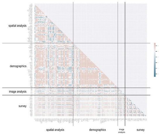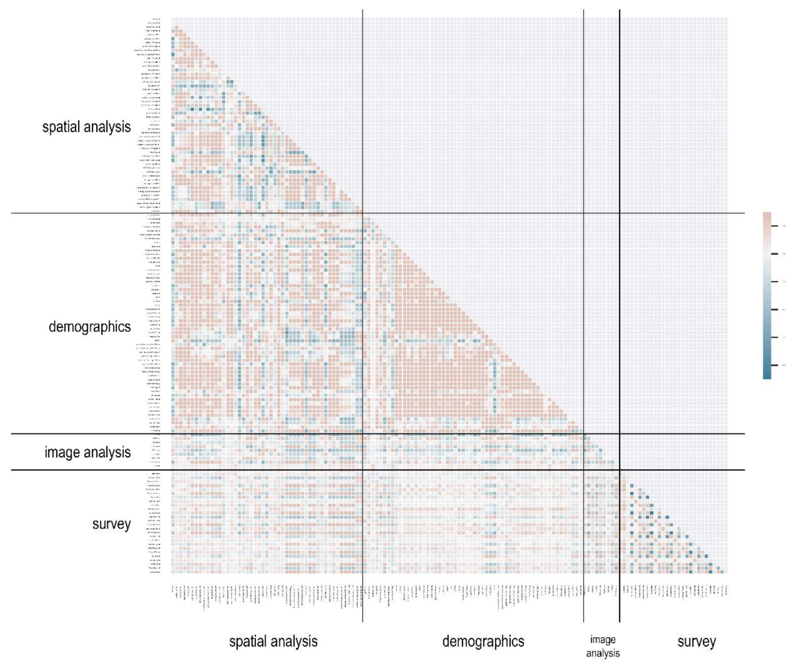 Correlation matrix of GIS data, demographics, image analysis and survey results. The figure is to be read based on colour; bright red and blue colours indicate strong positive (red) or negative (blue) correlations. Muted colours indicate weak correlations. For a detailed list of the spatial and demographic metrics used, please see Appendix A, Table A1.