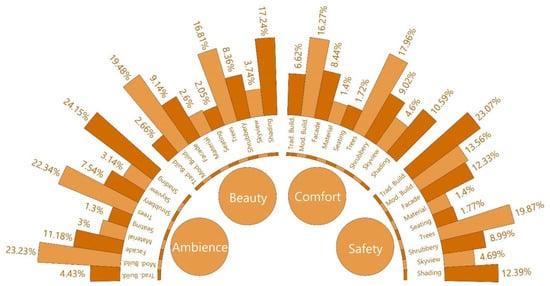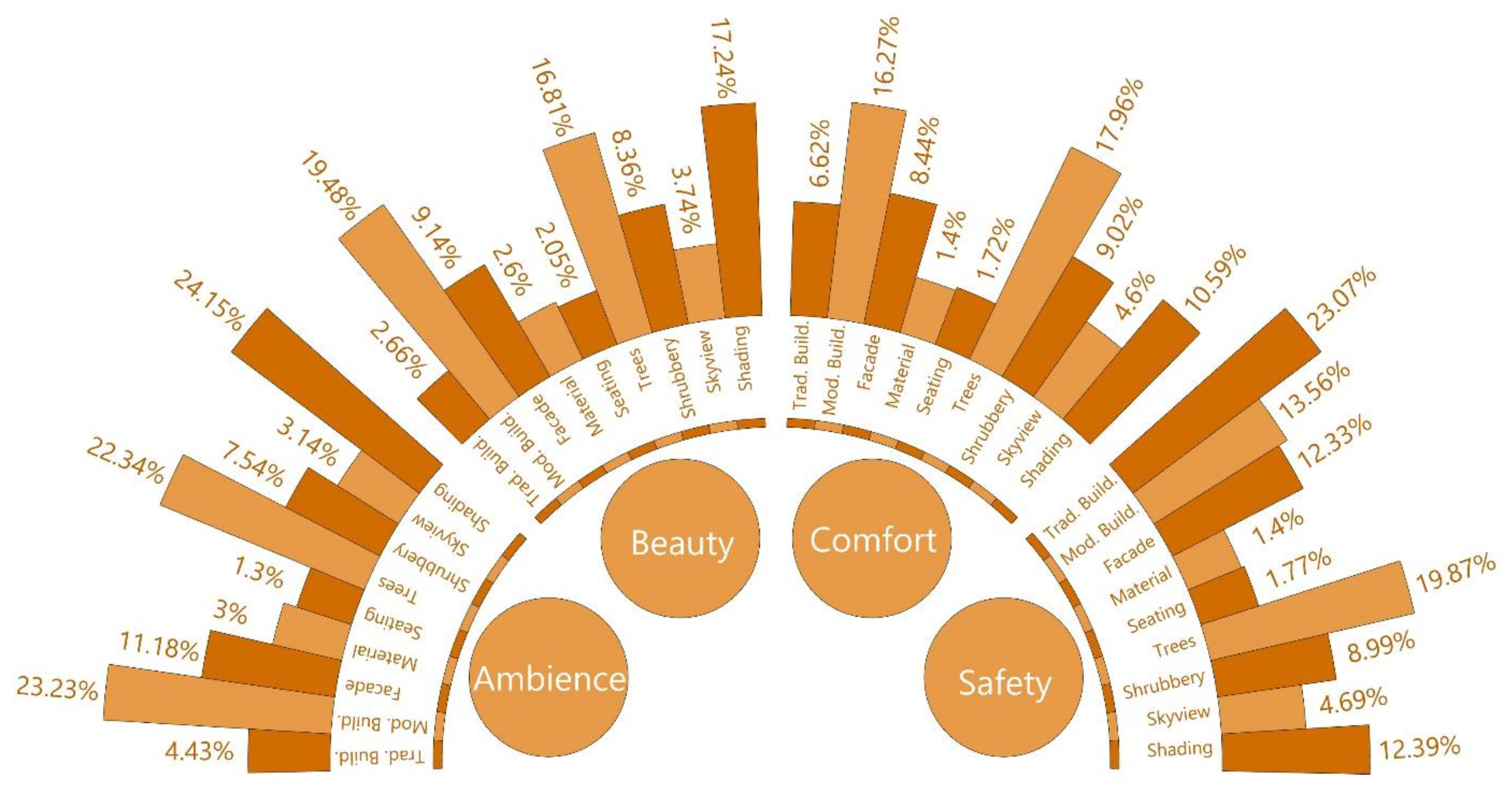 The final step of this research was a secondary analysis of the highest-ranked images. The images were ranked according to their dominant values within the Pareto front (with the dominant value of 0 at the top) and plotted against the key dominant categories identified in the image segmentation and GIS analysis results. These urban quality categories include sky view factor, trees, low-level shrubbery coverage, public seating, shading (provided by trees, canopies and umbrellas), façade activation (including glass storefronts and restaurant/café street extensions), modern façade materials, traditional façade materials, and pavement material variations. Categories such as people and cars were omitted because they were not considered design factors (they indicate space use, but this can be identified through other categories). This analysis was conducted on ambience, beauty, safety and comfort. The fifth trait, character, was not included because the survey results indicated the respondents interpreted its meaning differently, giving an irregular and almost random pattern of responses.