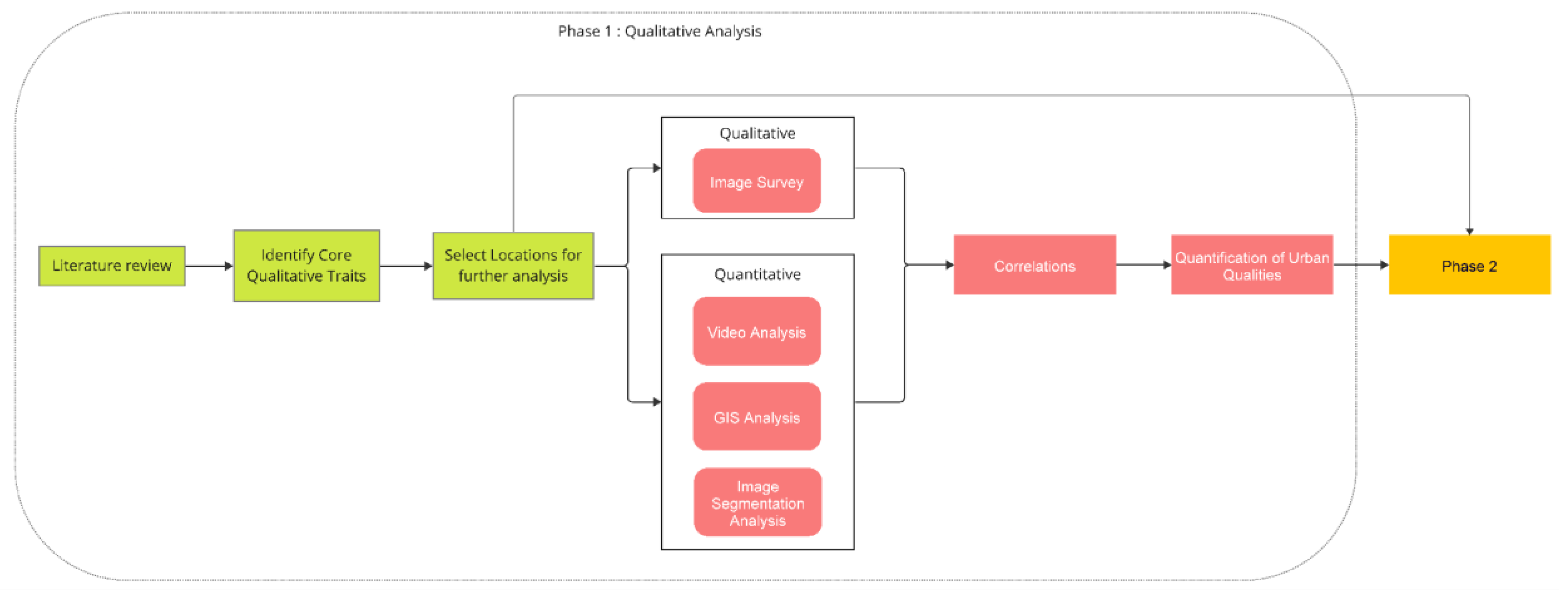In recent years, the demand for evidence-based design strategies has grown as policymakers seek to improve the quality of spaces to create more enjoyable and healthy user experiences. However, there is no single optimal approach to quantitative analysis of the quality of urban space. Existing methods of qualitative analysis of urban space have varying advantages and limitations, but each contributes uniquely to a deeper understanding of urban environments. This paper proposes a new approach for quantifying quality in design, consisting of the analysis of site photos, image surveys, spatial analysis, and correlation of subjective and spatial data, as outlined below.