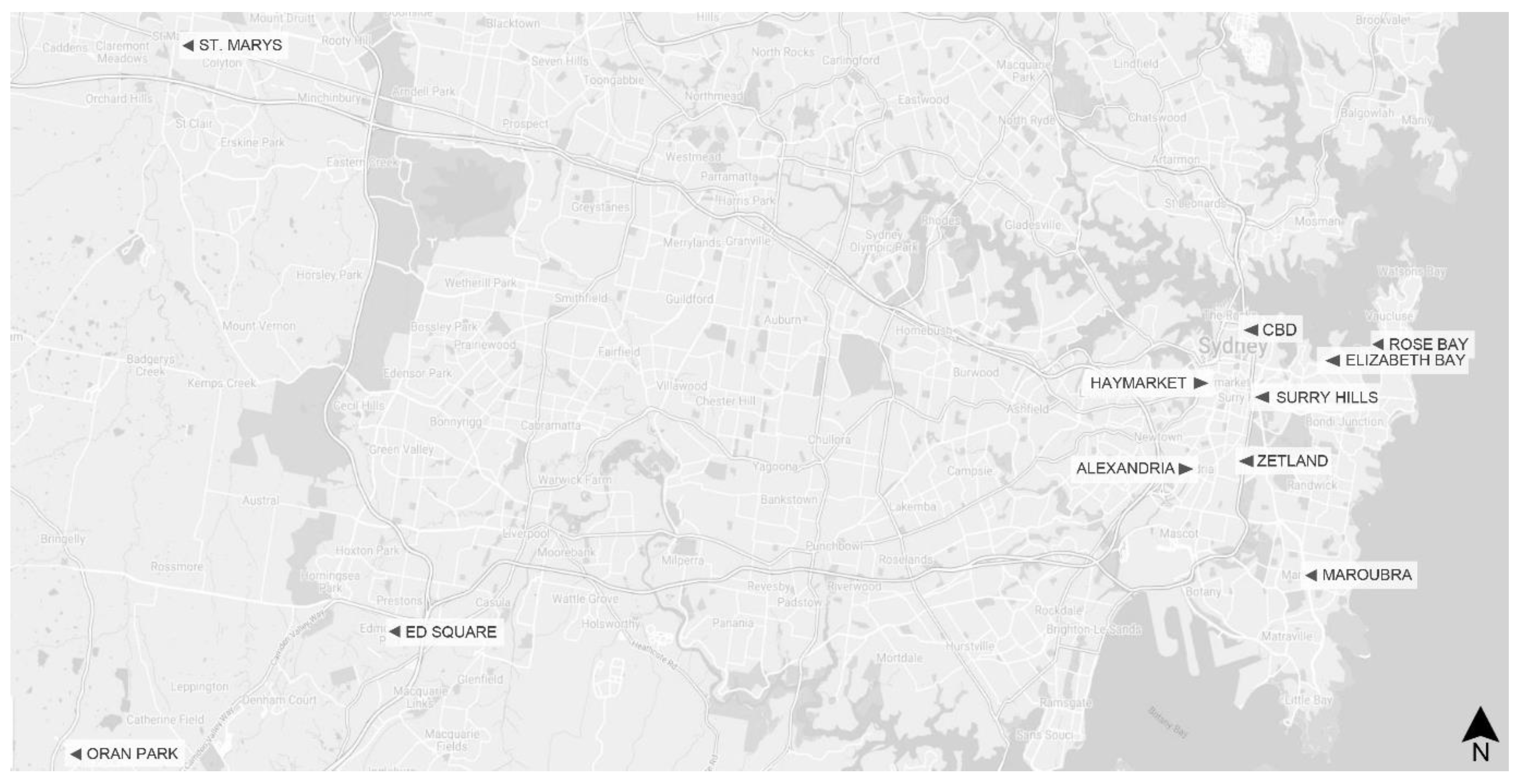 The initial step in the proposed method entailed the collection and organisation of a comprehensive set of site photographs that showcase a diverse range of urbanscapes, building types, architectural styles and environmental contexts. To ensure broad representation, the research team visited 11 suburbs across Sydney (Figure 2), chosen for their unique characteristics and varied urban landscapes (Table 1). Photographs were taken on an iPhone, in Landscape format at eye level, across two weeks in October (Spring), between late morning and early afternoon in weather conditions that was clear with some overcast.