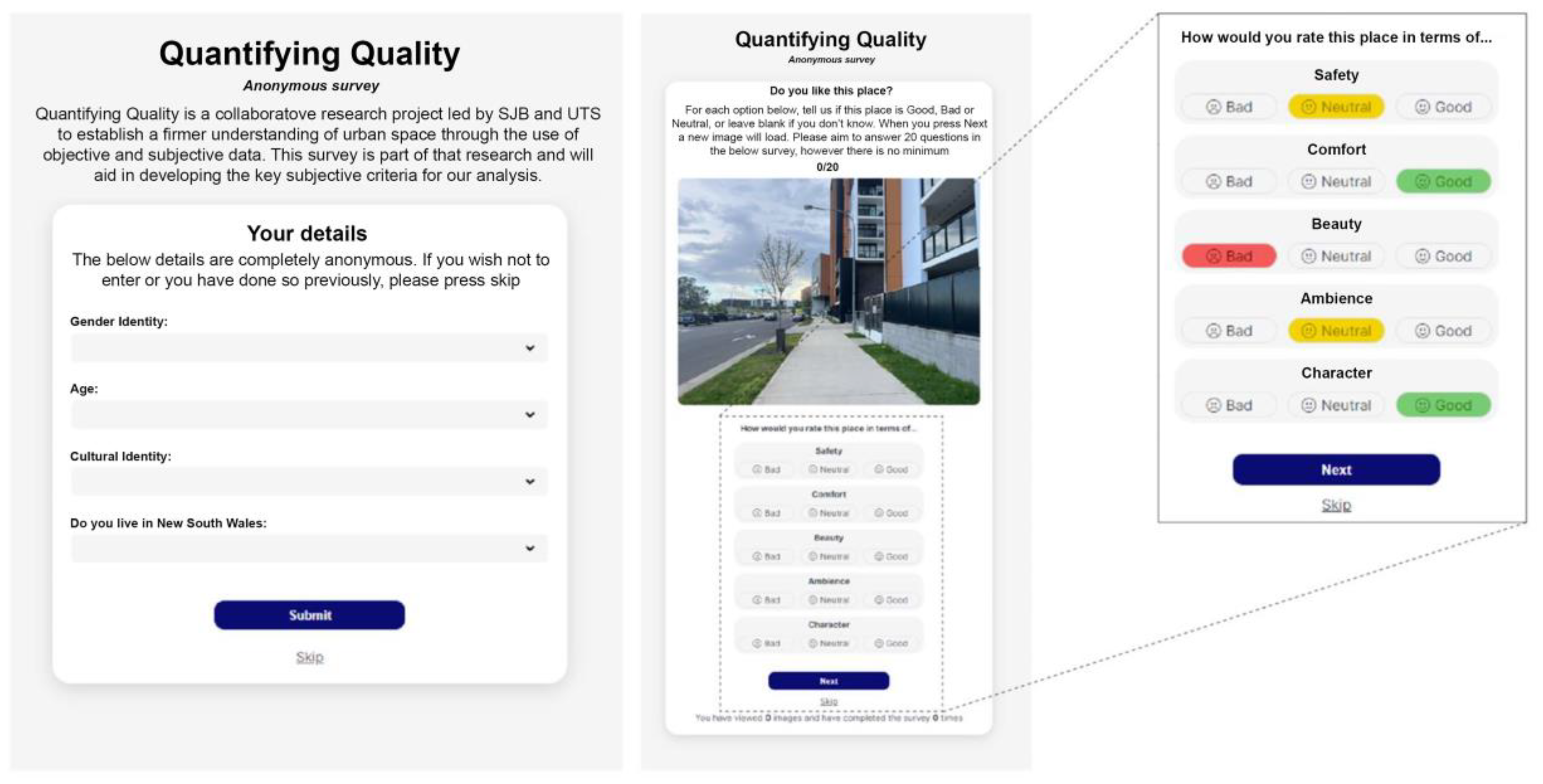 After selecting sample images, an anonymous online image survey was conducted to gather subjective data regarding aesthetic preferences, perceived functionality and overall satisfaction with the urbanscape showcased in each image. The survey was advertised through public channels (including LinkedIn, Instagram), email blasts to colleagues, industry contacts and school newsletter subscribers, and through posters displayed throughout the university campus. It was hosted on a public website and open between 7 November 2022 and 13 March 2023 (126 days).