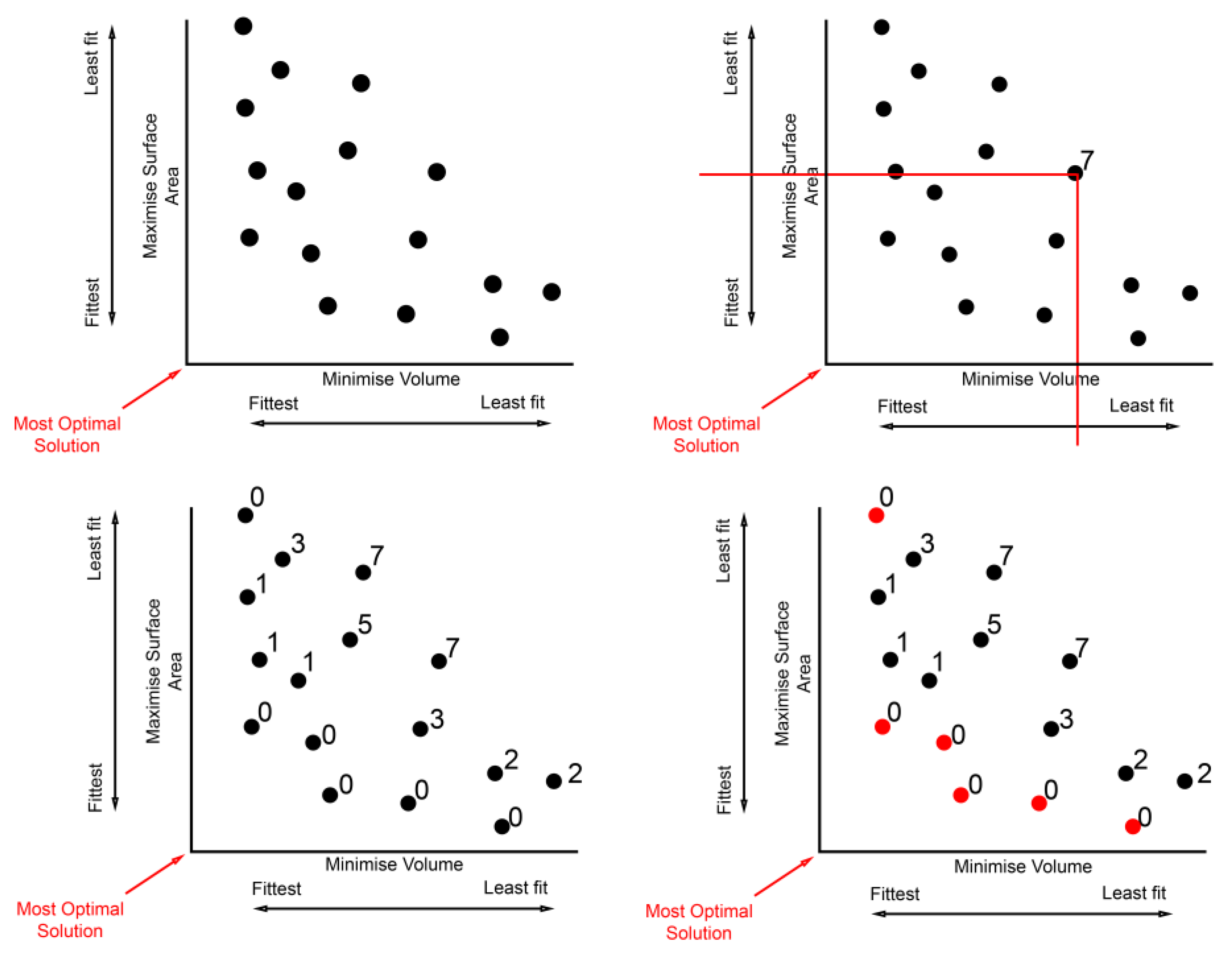 Description of the Pareto front using two objectives. The plotted solutions with a dominance value of 0 (highlighted in red) are part of the Pareto front.