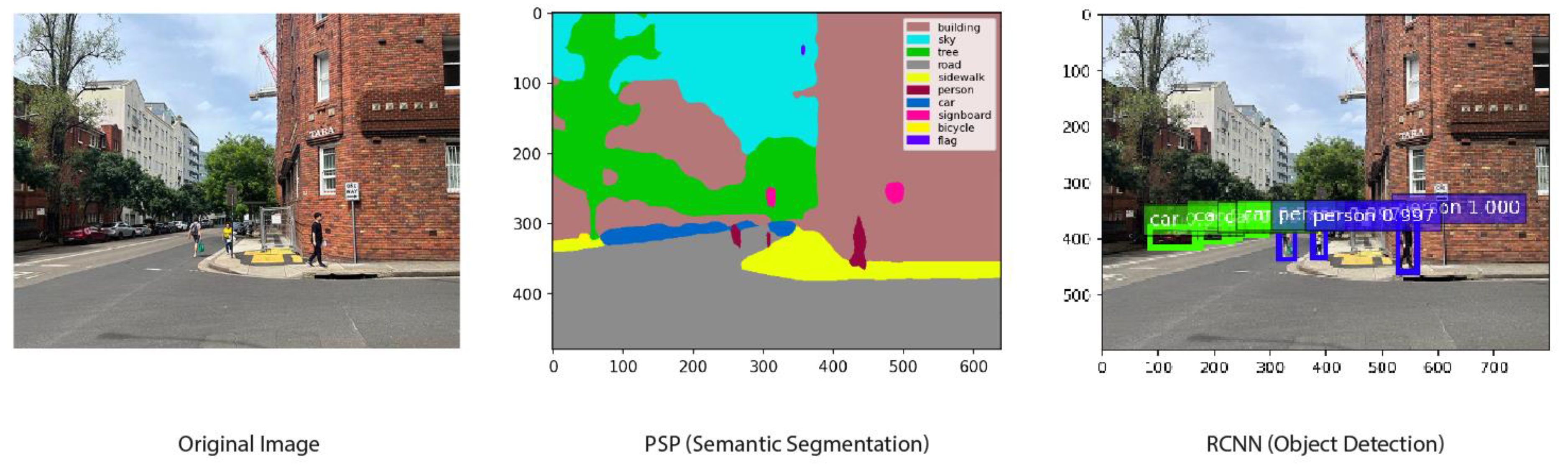 Pyramid Scene Parsing Network (PSPNet) and Region-based Convolutional Neural Network (R-CNN) were employed for robust image segmentation, object detection and analysis. PSPNet is a deep learning architecture designed for semantic image segmentation. It utilises a pyramid pooling module to capture multi-scale contextual information, enabling precise pixel-level classification and segmentation of objects within an image [56] is a widely adopted framework for object detection and localisation. It generates a set of region proposals (potential object locations), then extracts features from these regions using a convolutional neural network, refining the proposed regions to accurately identify objects of interest [57]. Both models were sourced from the GluonCV model zoo [58], and were used as fixed, pre-trained models for feature extraction rather than as part of a supervised training workflow. PSPNet was pre-trained on the Cityscapes dataset [59], and R-CNN on the Pascal visual object classes dataset [60]. Figure 5 depicts PSPNet and R-CNN outputs for an image from the survey. PSPNet was the primary segmentation method; R-CNN was used selectively to assess traits that required object counts, such as the number of cars or trees in an image, rather than their proportional coverage.