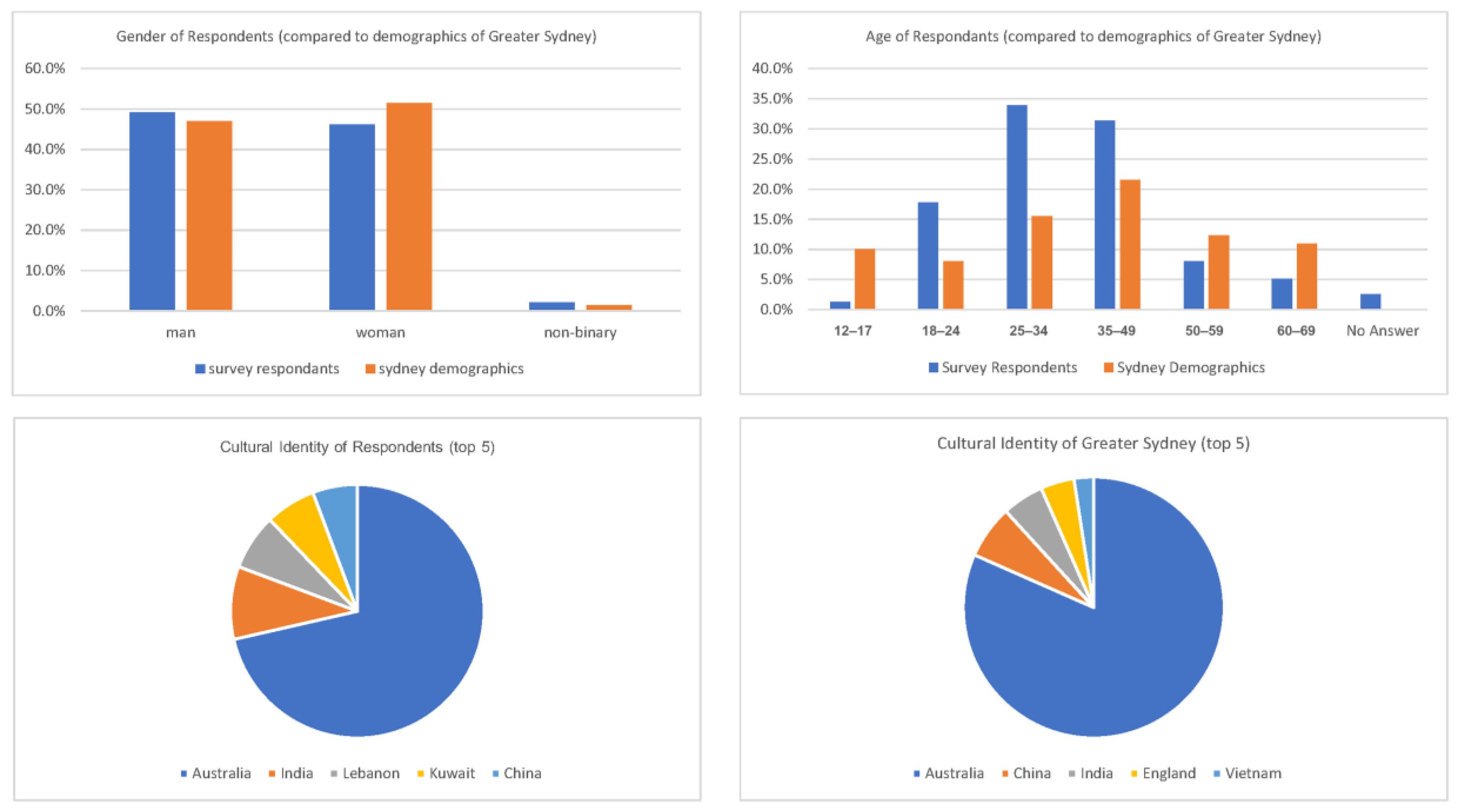 Age, gender and cultural identities of survey respondents compared to Greater Sydney demographics.
