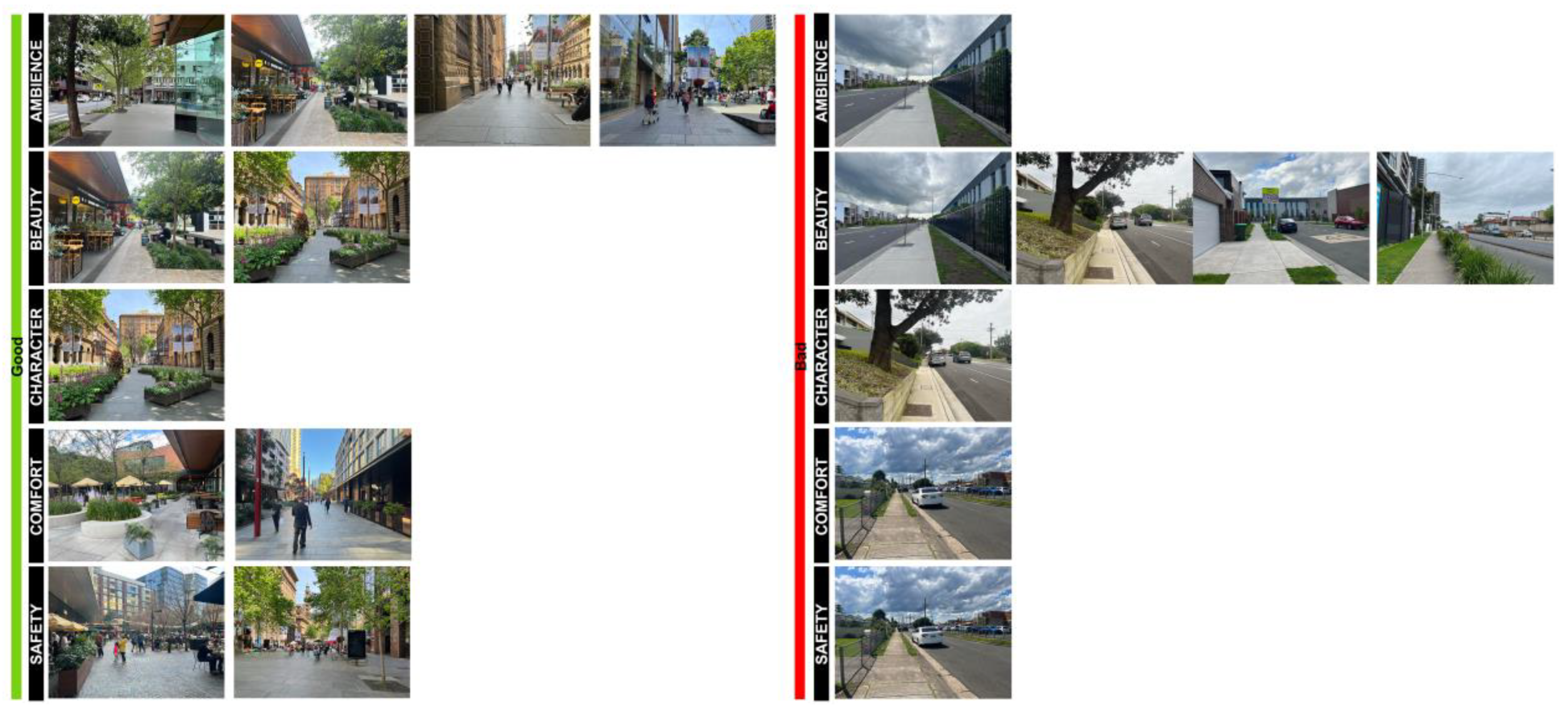 The primary goal of the process outlined above was the numerical quantification of subjective perceptions of urban space for use in either urban analysis or urban design and generation. As such, the clarity and relatability of the keywords used to represent urban quality were fundamental to the survey’s success. Moreover, the keywords had to avoid design language that would be deemed too complex or designer-focused to ensure the respondents could assess the images against the keywords with clarity and minimal confusion. In this context, five keywords—Beauty, Comfort, Safety, Ambience and Character—were chosen, reflecting inhabitants’ perceptions of the urban environment during day-to-day navigation. They were extracted from the literature [7,32,38], consultation sessions with a leading urban practice in Sydney that is currently involved in work related to quality assessment and place making (SJB), and urban qualities defined by the New South Wales (NSW) Government as part of its placemaking strategy [47,48].