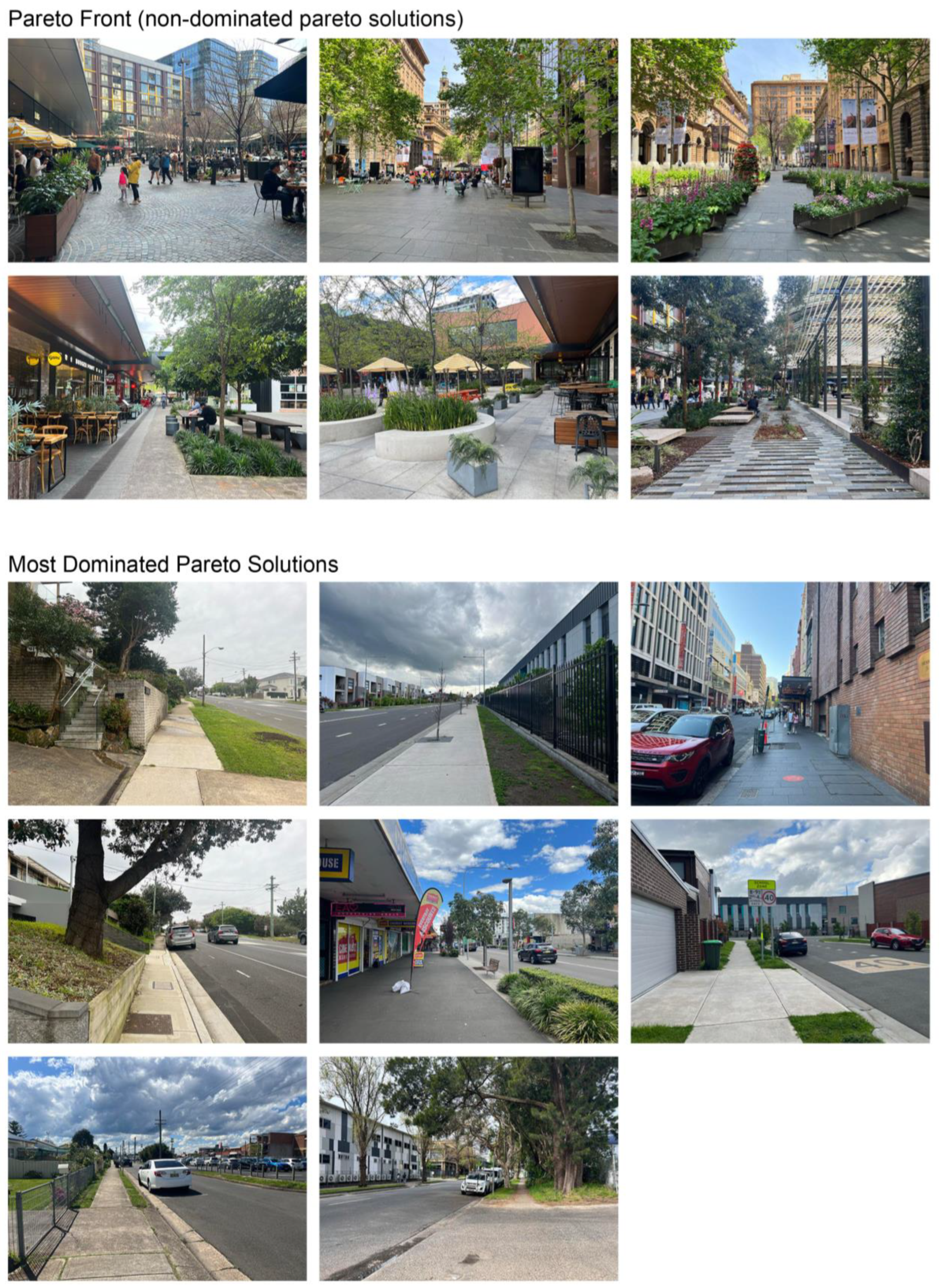 The scores for the highest and lowest-ranked survey images were correlated against the results of the image segmentation analysis for their locations, revealing distinct patterns). Notably, the presence of walls did not differentiate the ranked images: more walls were observed in negative Pareto fronts. This raises concerns about the ability of software to distinguish between walls and buildings. The low-ranked images exhibit a slightly higher mean proportion of sky, possibly indicating an imbalance in scene composition or a lack of relevant objects in the foreground. In contrast, high-ranked images include more trees, emphasising the positive contribution of greenery to visual aesthetics. Furthermore, high-ranked images exhibit significantly fewer roads and more footpaths, suggesting a preference for scenes with more open space and pedestrian-friendly elements.