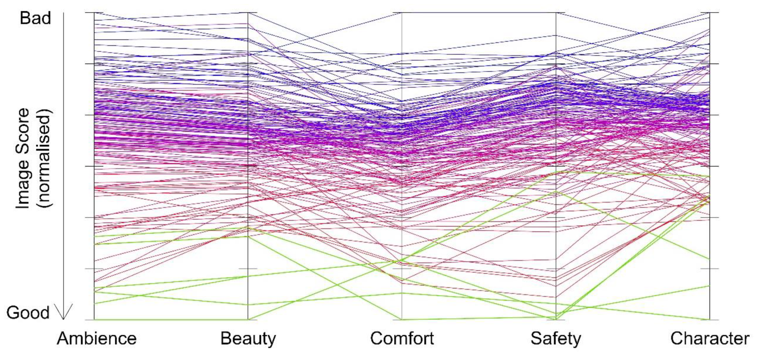 The Pareto ranking of the survey results yielded 6 images on the Pareto front for good and 8 images on the Pareto front for Bad (Figure 8), which reflected similar characteristics as the individual ranking for each trait presented in Figure 7. Further analysis was conducted on the survey images to identify which traits were in conflict (Figure 9). As can be observed, in most images, there is clear conflict between the traits; however, certain images demonstrate strong correlations, especially between ambience and beauty, and comfort and safety (respectively).