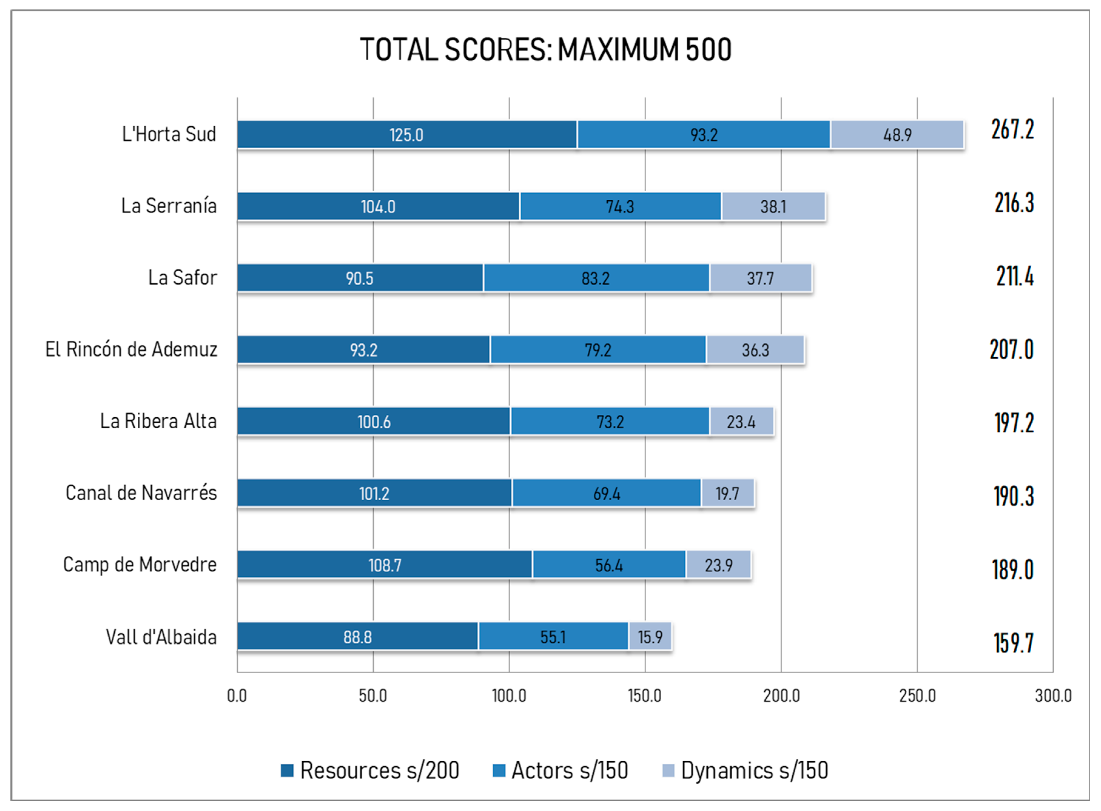 | Canal de Navarrés | Territory with low levels of competence for development in terms of dynamics, with limited competencies and certain difficulties in terms of actors, and which does not make full use of its competencies in resources. |