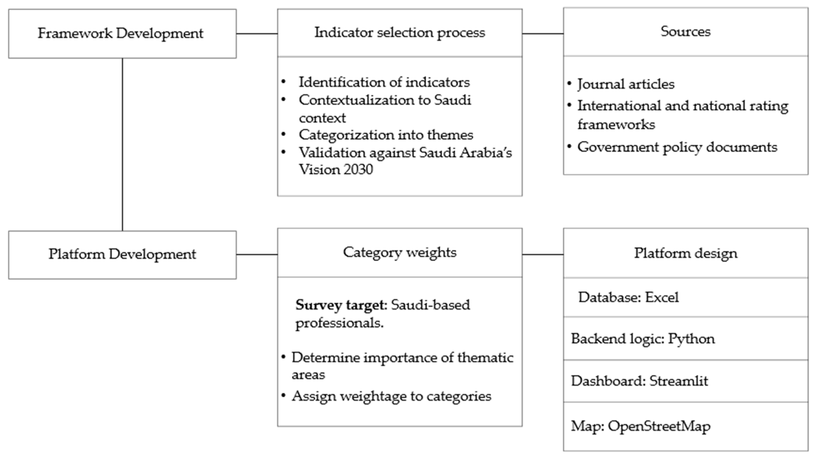 Data for indicator identification and framework development were collected from (i) Journal articles [38,39,40,41], (ii) International rating frameworks (e.g., LEED-ND, BREEAM Communities, ISO 37122 [14]), and (iii) Government policy documents (e.g., Saudi Vision 2030). Triangulation was achieved by analyzing the frequency, relevance, and adaptability of indicators across multiple sources for comparison and validation.