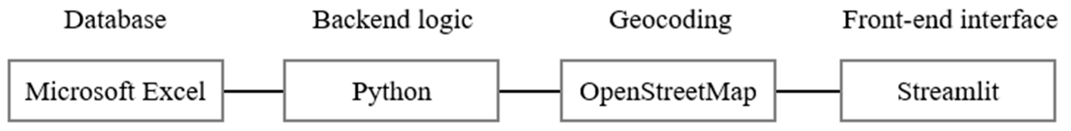 The development of the platform utilized an integrated set of technologies, with each component serving a specific function in the overall system architecture, as shown in Figure 2. At the foundation, Excel was used to store indicator benchmarks and input data. Python served as the core processing engine, handling the scoring logic and data flow. To enable spatial visualization, geocoding was applied to map each neighborhood to its exact location using OpenStreetMap. Streamlit was implemented as the front-end interface to deliver a user-friendly web application.