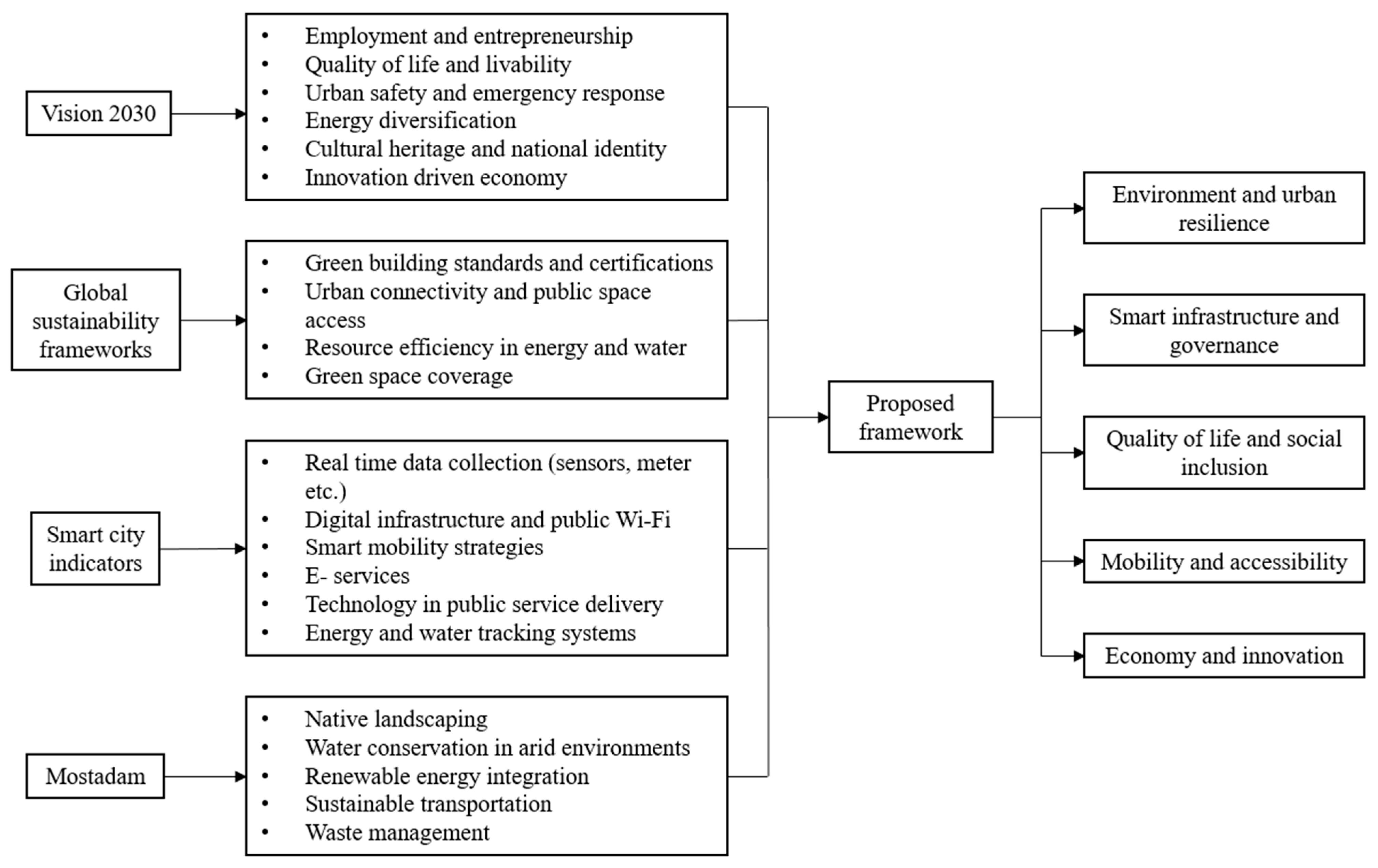 Saudi Arabia is currently undergoing a transformative phase under Vision 2030, which prioritizes sustainable urban development and the integration of smart city concepts [8]. This makes it crucial to create a framework that ensures smart and sustainable development [9]. The nation’s commitment to technology-driven and environmentally responsible urbanization is evident in large-scale initiatives such as the NEOM megacity, the Red Sea Project, ROSHN’s residential developments, and the Saudi Green initiative [10]. These projects aim to redefine urban living by incorporating cutting-edge technologies and sustainable design principles.
