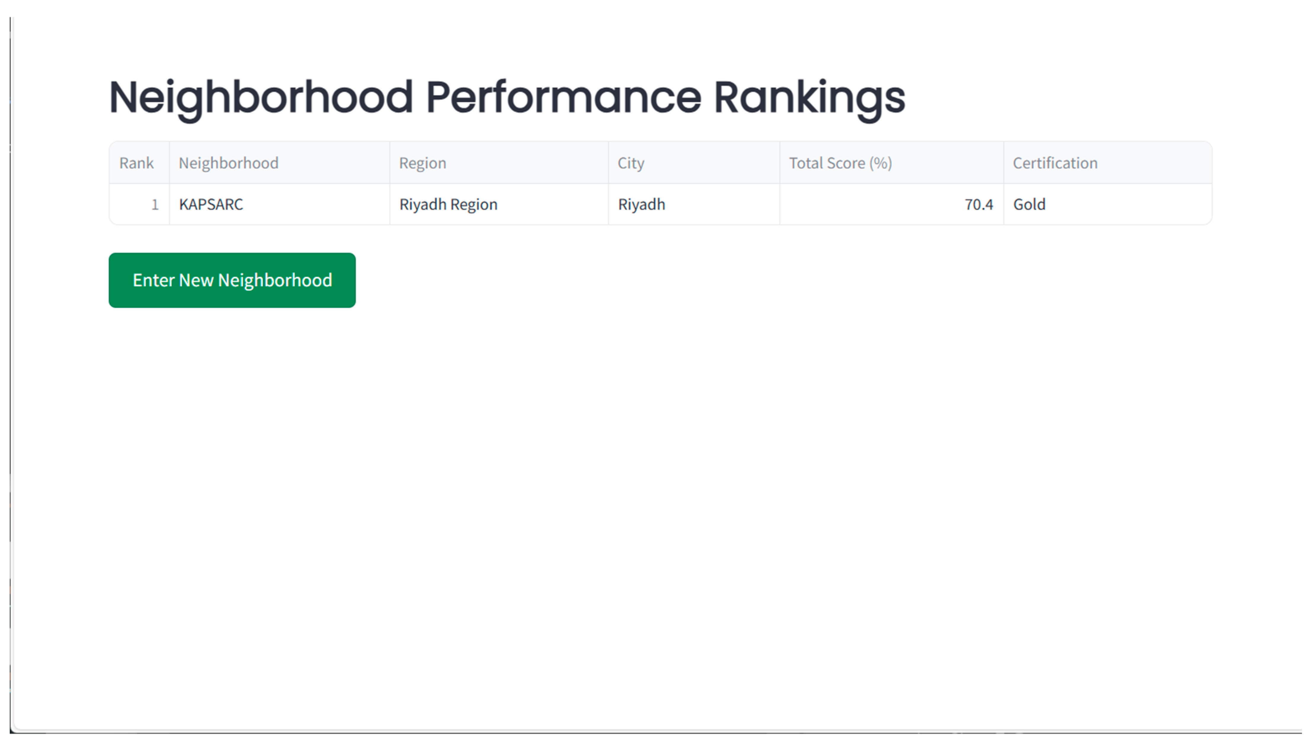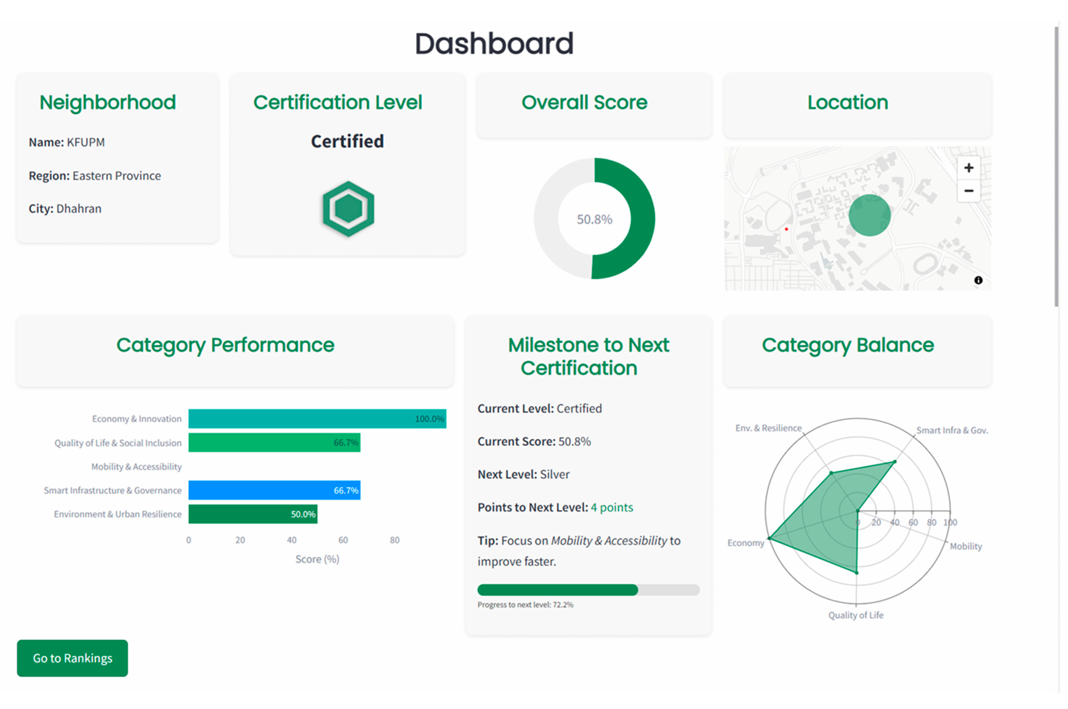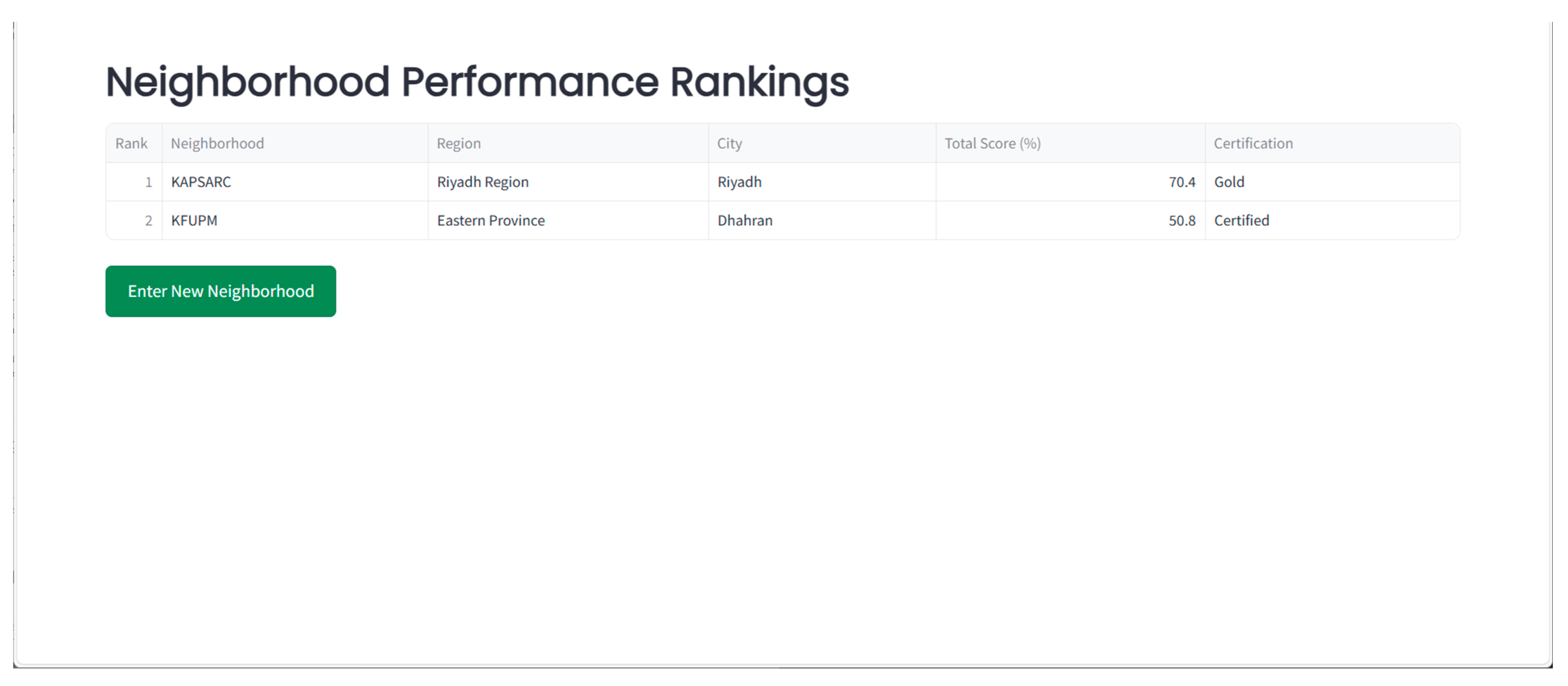 By focusing on the neighborhood scale, this research provides a more detailed and practical approach to urban development and ensures that projects align with Vision 2030’s sustainability and smart city goals. The proposed platform will serve as a standardized assessment tool, enabling policymakers, real estate developers, and urban planners to make informed, data-driven decisions. It will integrate key environmental, technological, and socio-economic factors to ensure that urban developments are both smart and sustainable.