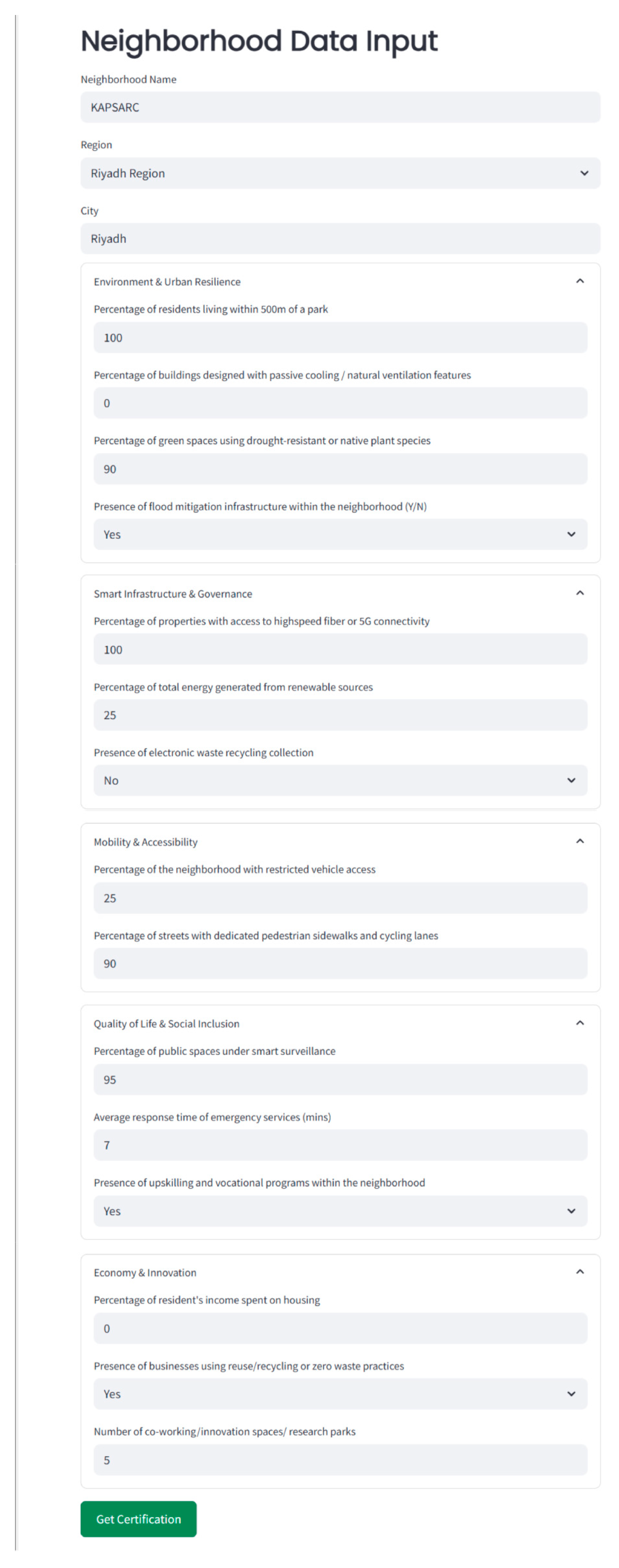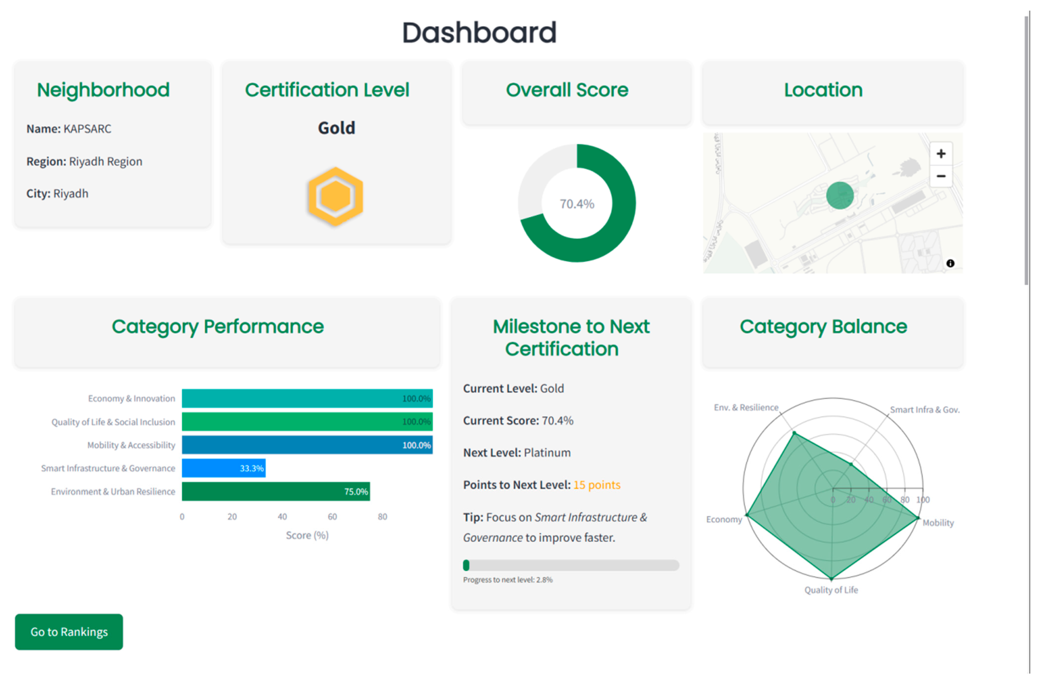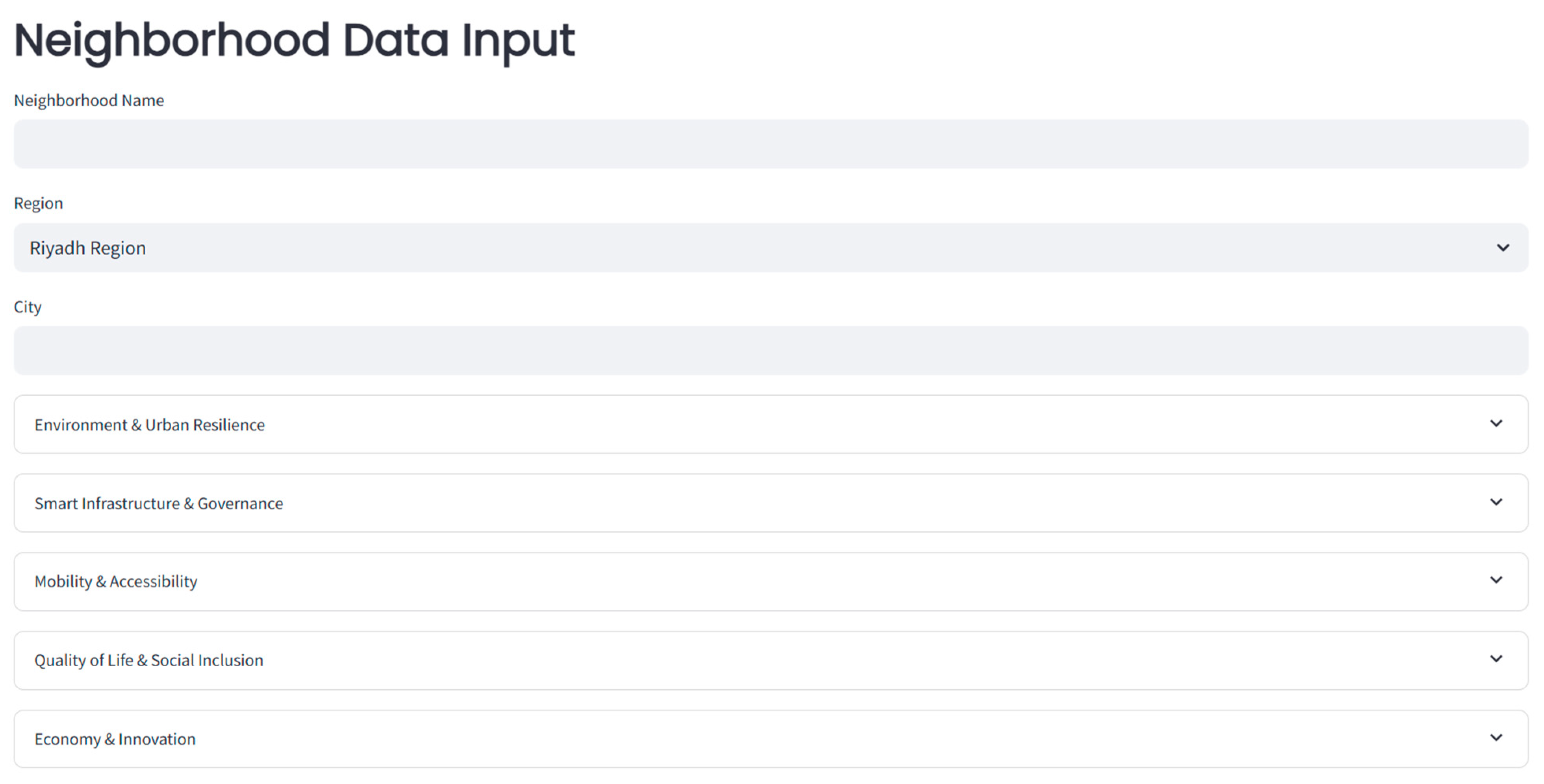 By focusing on the neighborhood scale, this research provides a more detailed and practical approach to urban development and ensures that projects align with Vision 2030’s sustainability and smart city goals. The proposed platform will serve as a standardized assessment tool, enabling policymakers, real estate developers, and urban planners to make informed, data-driven decisions. It will integrate key environmental, technological, and socio-economic factors to ensure that urban developments are both smart and sustainable.