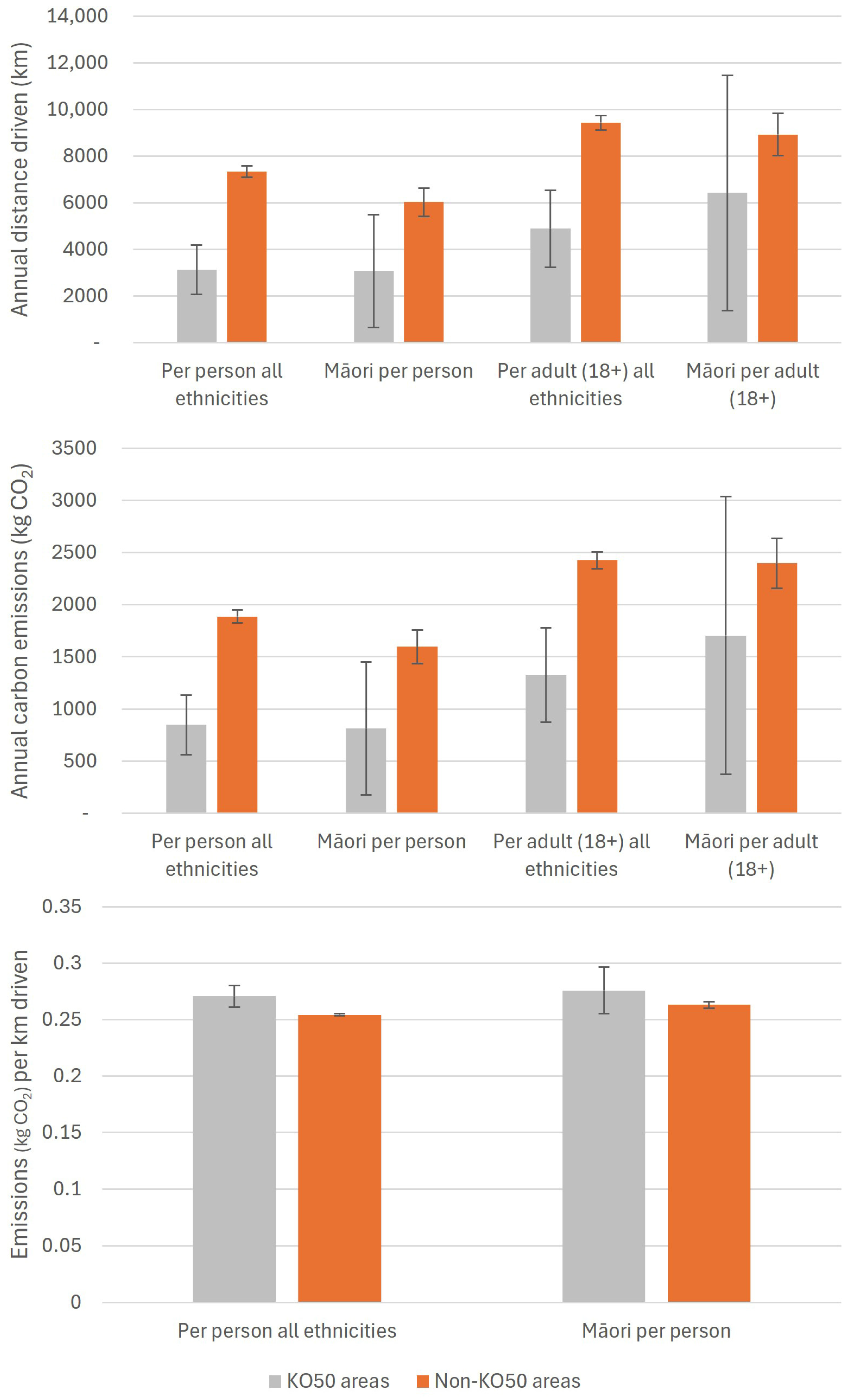 Figure 1. Total annual private motor vehicle distance travelled (data from mid-2012 to early 2020) and annual carbon emissions (kg CO2) from driving per person and per adult (age 18+) according to area of residence (NZTS) and ethnicity, with 95% confidence bars.