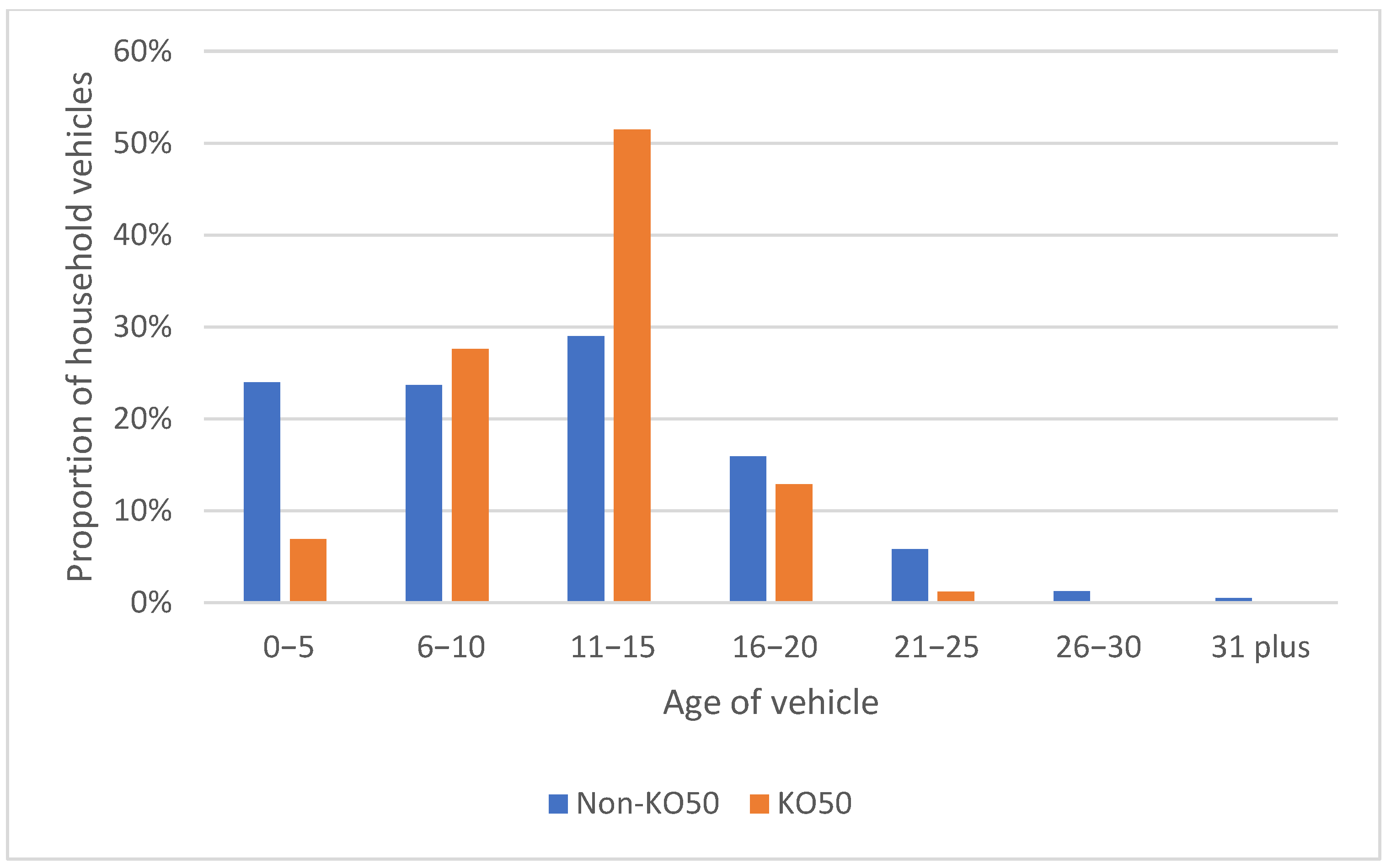 Figure 2. Proportion of household vehicles according to age (years since manufacture) for KO-intensive areas (KO50) vs. the rest, with imputation of vehicle age when missing (see text).