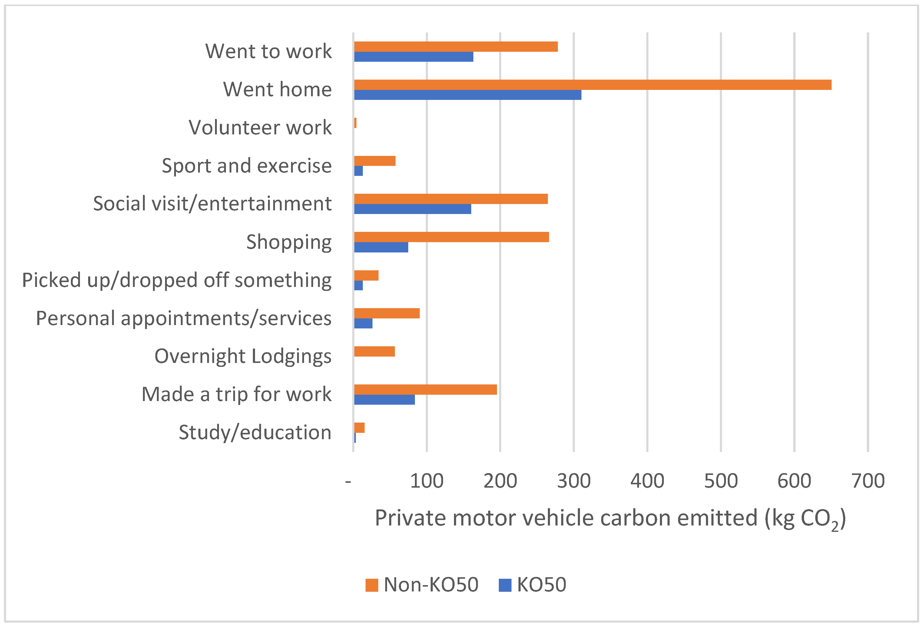 Figure 3. Amount of private motor vehicle travel carbon emitted (annual, kg CO2) per person in KO-intensive areas (KO50) and other areas (Non-KO50) according to purpose of trip.