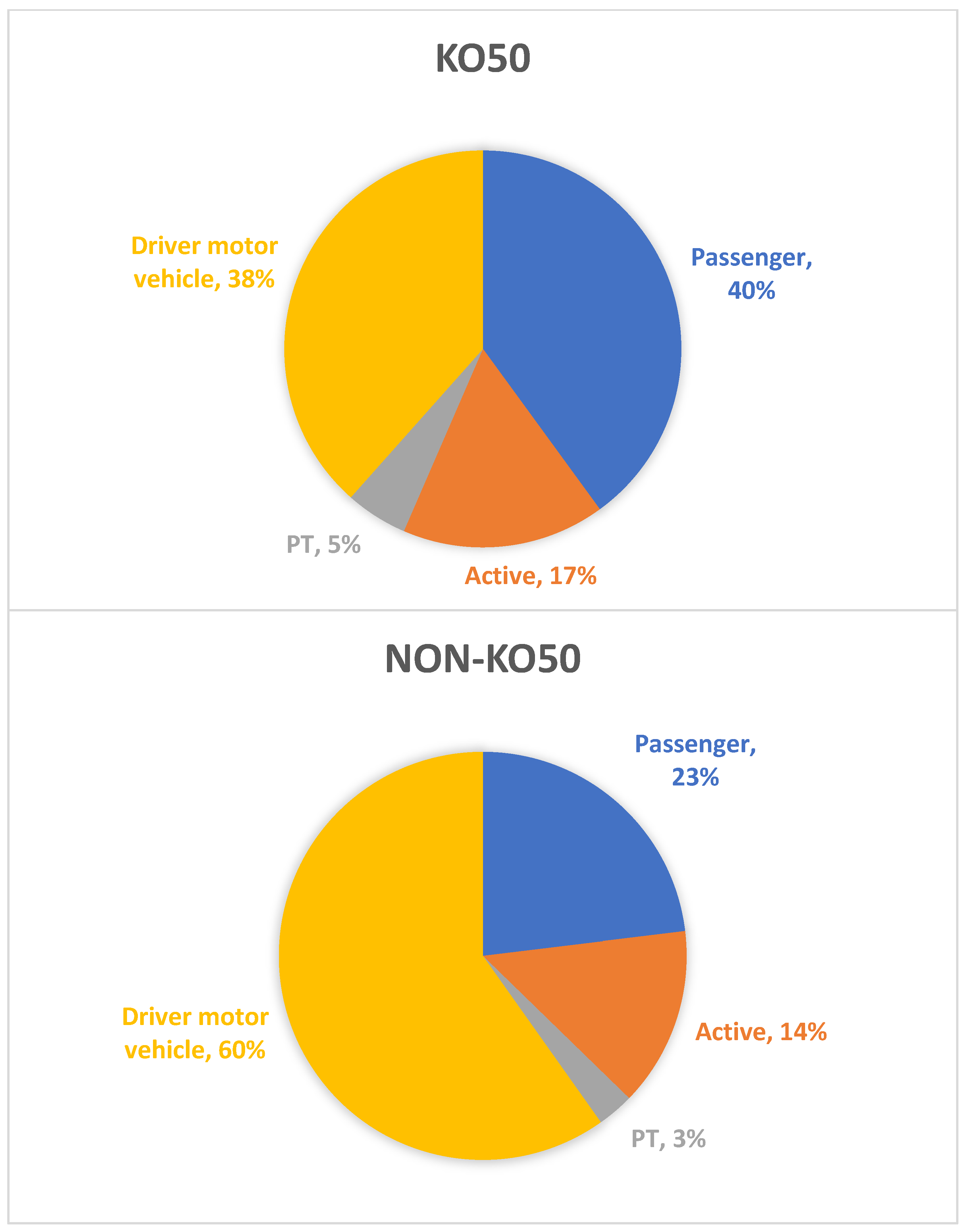 Figure 4. Estimated proportion of all trips made according to travel mode for KO-intensive meshblocks (KO50) and all other areas (Non-KO50).