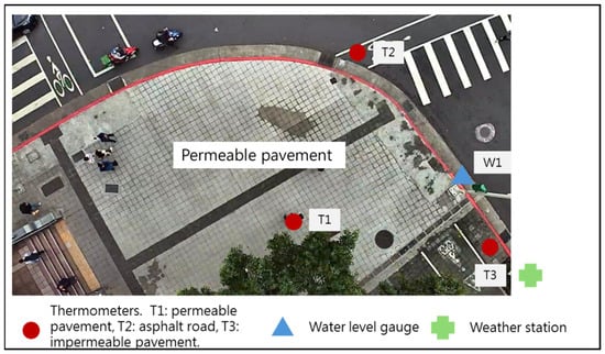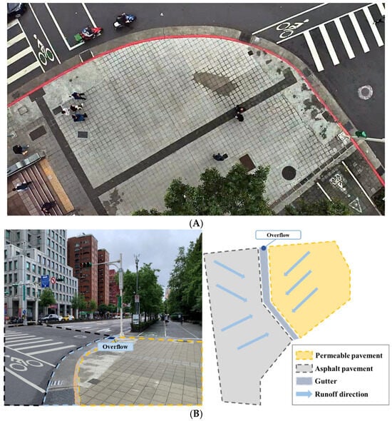 The site selected for this study was located at the intersection of two major roads in Taipei City, on the sidewalk in front of the Zhongxiao Xinsheng MRT Station exit. This site features three types of pavement: permeable, impermeable, and asphalt pavement, all of which are adjacent and in similar conditions, making it a suitable control area for long-term comparisons. The original road pavement was impermeable, but the pavement in front of the MRT exit was converted to permeable due to sidewalk improvements. The permeable pavement was completed in 2020, and monitoring began in March 2021. In addition to the pavement thermometer, a triangular weir and water level gauge were installed in the roadside drainage ditch to measure runoff within the area. The drainage ditch’s collection area covers a portion of the road’s asphalt pavement and the permeable sidewalk. Not all runoff from the permeable sidewalk area will flow into the outfall where the water level meter is installed. On-site measurements revealed that the drainage area of the runoff outfall contained 221.6 m2 of permeable pavement (sidewalk) and 393.9 m2 of asphalt pavement (road). Figure 1 shows its aerial view and the drainage area of the measured runoff outfall.