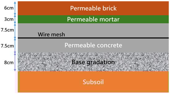 The permeable pavement was a multi-layered structure designed to balance infiltration, water storage, and structural stability. From top to bottom, it consisted of six layers (see Figure 2). It comprised 6 cm permeable bricks, 3 cm permeable mortar, 15 cm permeable concrete, and 8 cm graded concrete. The bottom layer was the subsoil, a natural foundation soil layer.
