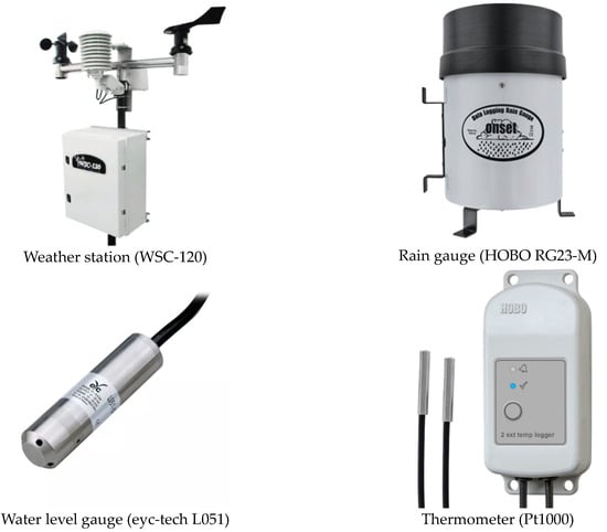 To understand the performance of permeable pavement under natural conditions, this study installed various monitoring devices at the site to record rainfall, pavement temperature, water level, and thermal comfort data. This included a small weather station, a WSC-120 (Jetec Electronics Co., Ltd., Taichung, Taiwan), which monitored temperature, humidity, wind speed, and solar radiation with a 5 min resolution. Precipitation was recorded using a HOBO RG3-M (Onset Computer Corporation, Bourne, MA, USA)rain gauge. For temperature monitoring, a Pt1000-grade (Fenri Co., Ltd., New Taipei City, Taiwan) temperature sensor was installed 5 cm below the surface of each of the three types of pavement to record surface temperature fluctuations. Runoff was measured using an eyc-tech L051 (Yuden-tech C., Ltd., New Taipei City, Taiwan) water level sensor and triangular weirs placed in the drainage ditch, and surface runoff was estimated using a weir-flow formula. The monitoring instrument locations are shown in Figure 3, and the monitoring equipment is shown in Figure 4.