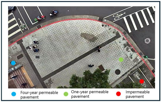 To thoroughly analyze the impact of different pavement types and years of use on pedestrian thermal comfort, WBGT tests were conducted. This was performed to compare the WBGT values of permeable and impermeable pavements. Additionally, the WBGT of permeable pavements after four years of use and one year of use was estimated. The permeable pavement of this base was completed in 2020 and has been in use for four years by 2024. However, part of the area was cleaned with a high-pressure water gun in October 2024. After the area was cleaned, an on-site infiltration test was conducted, and it showed that the infiltration rate exceeded the standard set by the Public Works Commission, as if it had just been installed. The required infiltration rate of permeable pavement is equal to or larger than 1 × 10−2 cm/s. Before cleaning, the on-site infiltration test was implemented to estimate the rate after four years of use. The test is the falling-head test, and Darcy’s law is used. This on-site experiment tested 5 points in the study area, and the average rate was 1.31 × 10−2 cm/s. This means that after four years of use, the permeable pavement still matches the required standard. However, after cleaning with a high-pressure wash, the infiltration rate increased to 1.64 × 10−1 cm/s, which represents a newly installed or one-year permeable pavement. Therefore, this study regarded it as “permeable pavement with one year of use”. The current permeable pavement, which has not been cleaned, was considered “permeable pavement with four years of use.” The locations of the three experimental objects are shown in Figure 5.