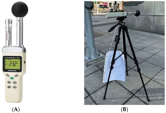 This study used the Tenmars TM-188D (Tenmars Electronics Co., Ltd., Taipei, Taiwan) Integrated Temperature Heat Index Meter to measure WBGT (Figure 6A). This device is a highly sensitive, fast-response capacitive humidity sensor designed specifically for monitoring the wet-bulb globe temperature (WBGT) index. It is suitable for environmental heat stress assessment and can be widely used in high-temperature workplaces such as factories, construction sites, sports fields, and training grounds to prevent health risks such as heatstroke and heat exhaustion. It also features maximum, minimum, average, and reading hold functions to ensure real-time monitoring of environmental heat loads. Furthermore, according to ISO 7726 [], the measuring instrument should be mounted at a height of 0.6 or 1.1 m, corresponding to the center of gravity height of a person in a sitting or standing position (Figure 6B). Therefore, this study used a measuring instrument mounted on a tripod 0.6 m above the ground and placed at the center of each measurement point. Depending on the site’s environmental conditions, the instrument’s placement could be fine-tuned to ensure data accuracy. Data was recorded every five minutes.