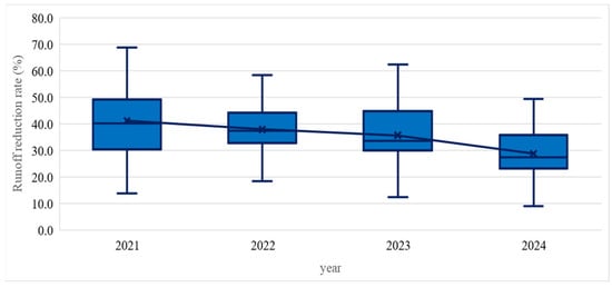 A significance analysis revealed that the effect of different rainfall patterns on runoff reduction efficiency was highly significant at the α = 0.05 level (p < 0.001), meaning that different rainfall conditions significantly affected the runoff reduction rate. However, the average runoff reduction rate did not differ significantly between years (p = 0.57). Although the average runoff reduction rate showed a downward trend over the years, the influence of different rainfall patterns prevented the inter-annual variation from reaching statistical significance. Therefore, the variability in runoff reduction efficiency of permeable pavement is primarily controlled by rainfall patterns. The results confirmed that rainfall patterns had significant impacts on runoff reduction. This is consistent with references [,,].