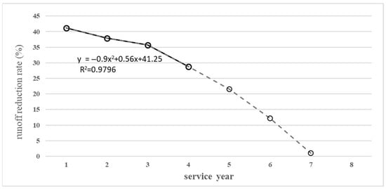 Using the four-year performance to predict the future trend, shown in Figure 8, it was estimated that the runoff rate will drop to 1% in the seventh year after operation. The clogging processes are not linear, but clogging might be cleaned by natural rainfall events. It is challenging to identify a suitable function to model the clogging process in the real world. For example, the reference [] focused on the clogging and cooling performance of permeable pavements. In their model, although clogging is nonlinear, a linear model was employed to illustrate the relationship between cooling performance and porosity in permeable pavements. Several regression models were tested in this study, and the quadratic equation had the highest R2. Therefore, the resulting trend was demonstrated, providing the prediction. If this pavement were operated as usual, it might lose its permeable function after 7 years.