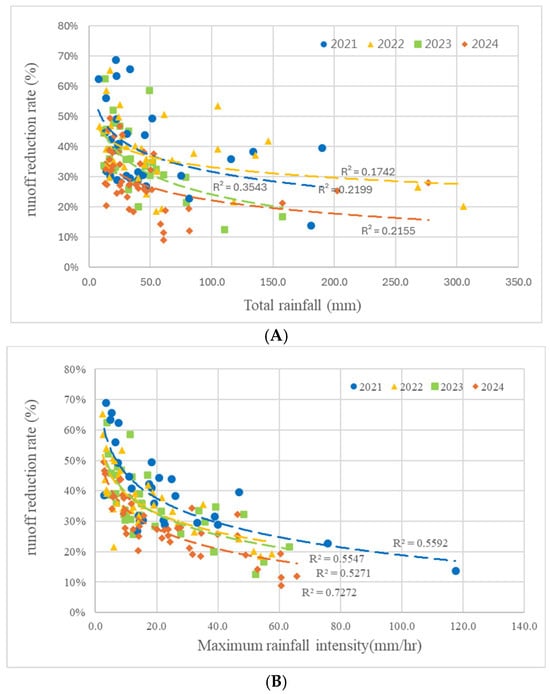 Relationship between permeable pavement reduction and rainfall characteristics. (A) runoff reduction rate (%) and total rainfall amount (mm), and (B) runoff reduction rate (%) and the maximum hourly intensity (mm/h).