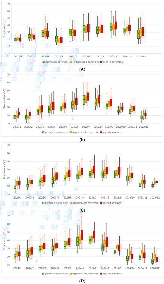 Surface temperature in different pavement types. (A) 2021, (B) 2022, (C) 2023, (D) 2024.