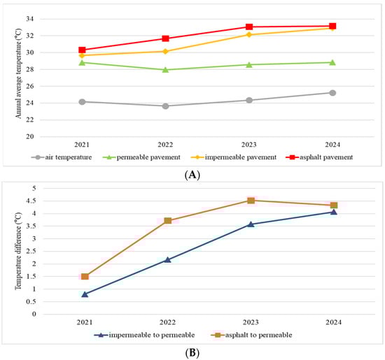 (A) The annual average surface temperature in different pavement types. (B) The temperature difference between permeable, impermeable, and asphalt pavement in different years.