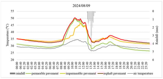 The surface temperature in different pavement types after a rainfall event, 9 August 2024.