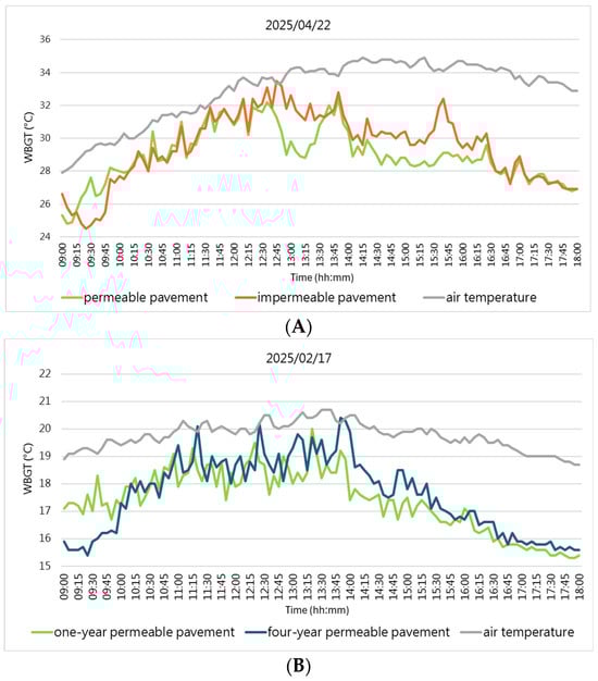 The observed WBGT results. (A) WBGT on permeable and impermeable pavement. (B) WBGT on one-year and four-year permeable pavement.