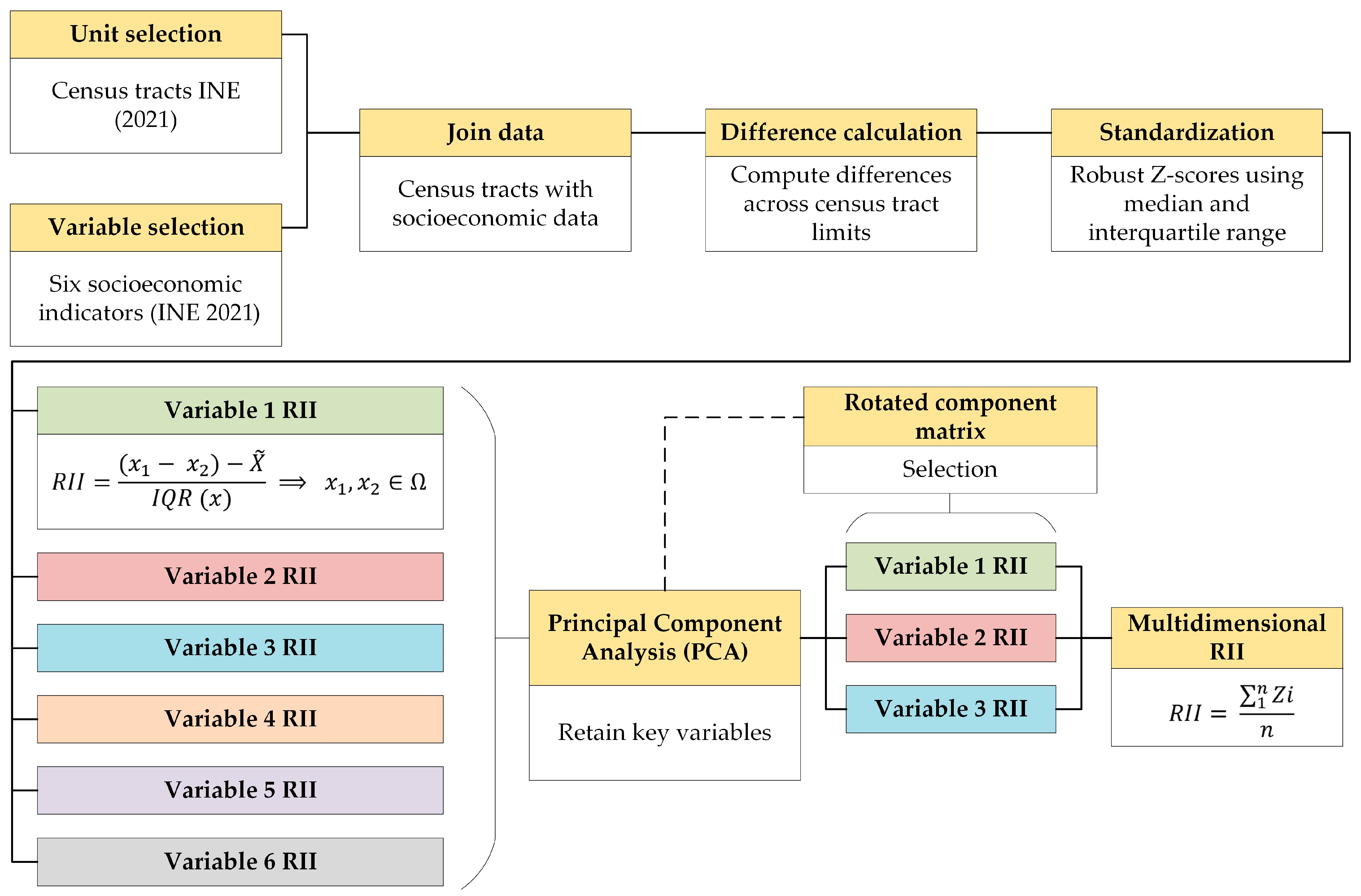| Segregation indices (e.g., Dissimilarity Index) | Population groups within units | Separation of social groups across space | Aggregates populations within fixed zones/Weak spatial context | RII incorporates adjacency and directionality of contrasts between neighboring tracts |