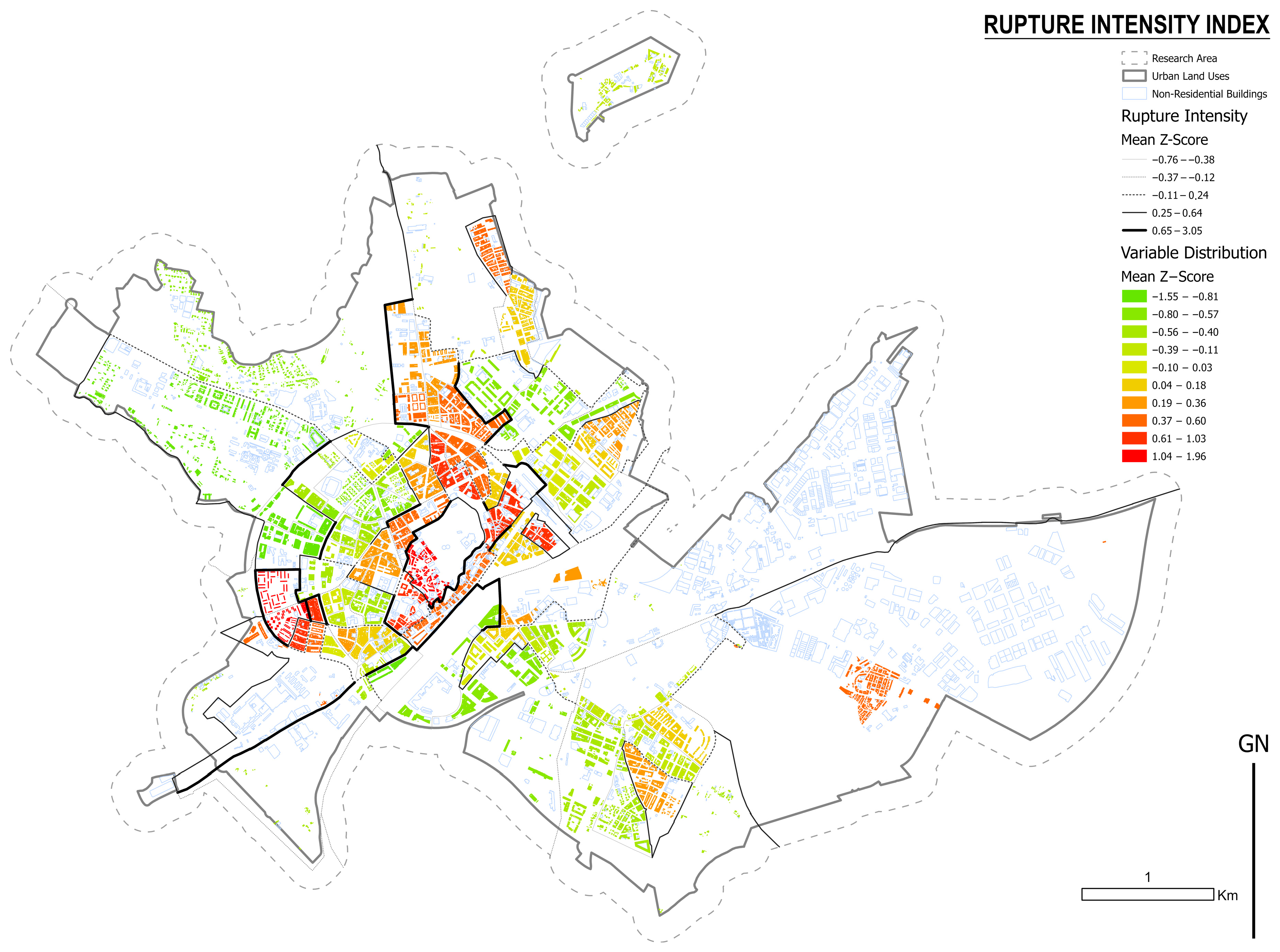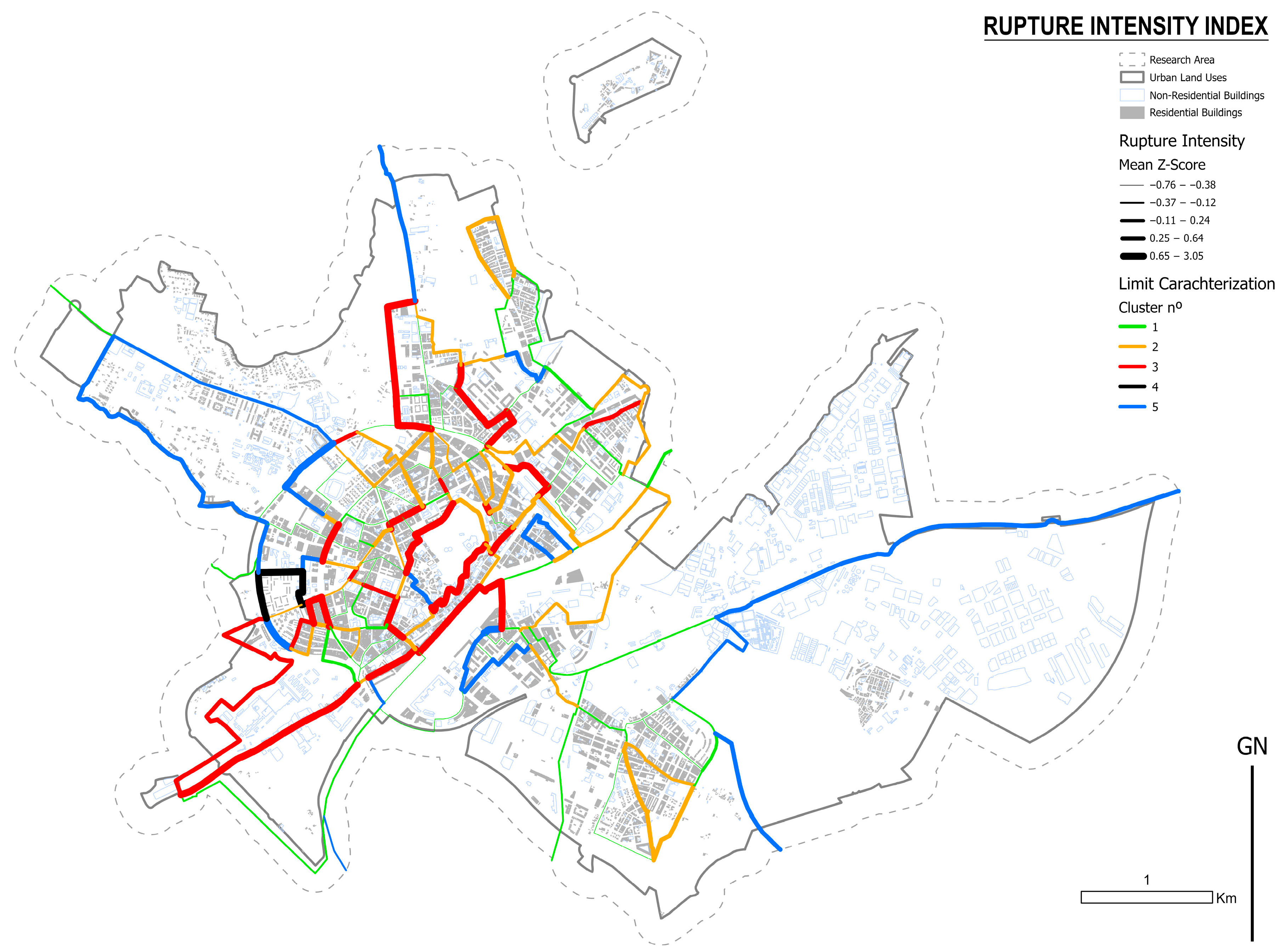 | Rupture Intensity Index (RII) | Limits between contiguous areas | Intensity of socio-spatial discontinuity | Requires detailed data and variable selection/It’s highly sensitive to scale factor | Provides a boundary-based, comparable, multidimensional measure of fragmentation |
