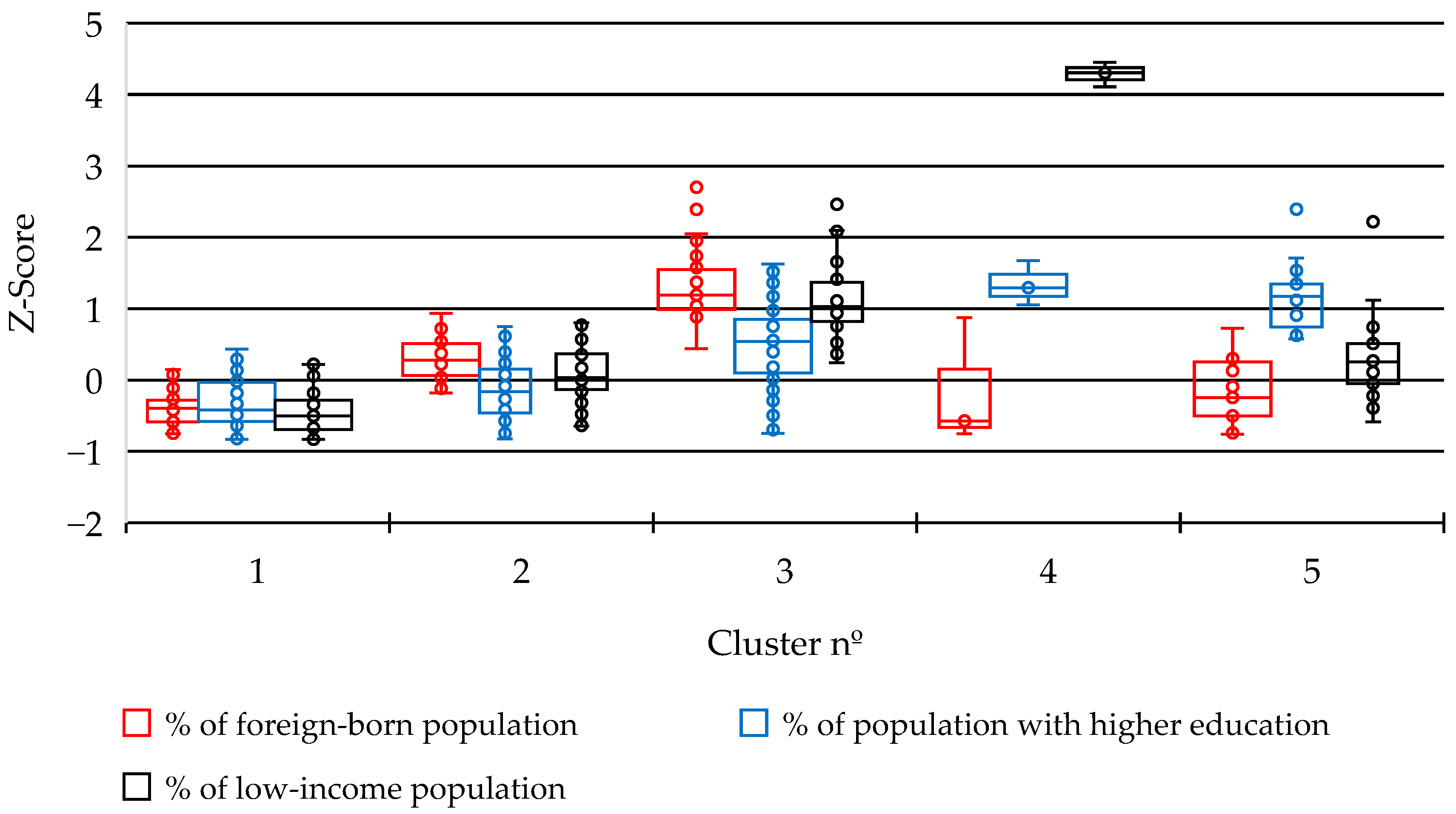 | Trend in Z-Score Values | % of Population with Higher Education | % of Foreign-Born Population | % of Low-Income Population |