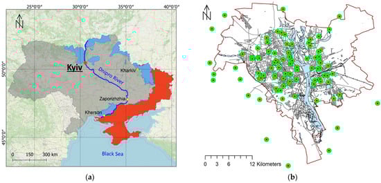 This study was conducted in the Kyiv metropolitan area (50.45° N; 30.53° E) (Figure 1), the capital city of Ukraine, with a total population of 2,952,301 in 2022 [] and a total area of 835.6 km2, located on both banks of the Dnipro River. Kyiv urban area is situated at the boundary between the Forest and the Forest-Steppe geographical zones, which have a temperate climate.