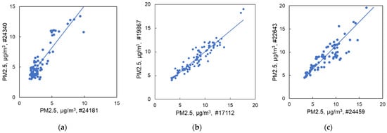 Comparison of hourly averaged PM2.5 data from the stations of different networks obtained on 1–5 June 2025: (a) Science.Community station #24340 vs. KCSA station #24181; (b) KCSA station #24181 vs. Airly station 17112; (c) KCSA station #22643 vs. KCSA station #24459.