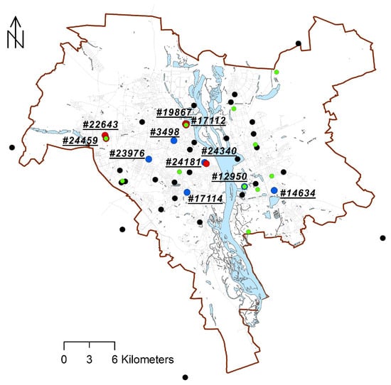 Map of Kyiv with labeled air monitoring stations used for cross-network verification (red dots); representative of PM2.5 temporal variations in different city areas (blue dots); used for interpolation testing reference stations (black dots) and validation stations (green dots).