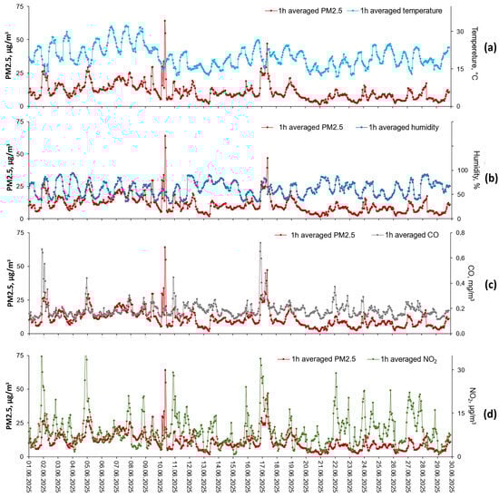 Figure 5 presents the hourly averaged concentrations of PM2.5 at the Station #14634, in comparison with the meteorological parameters and gas pollutants obtained for the period of intense Russian attacks on Kyiv in June 2025.
