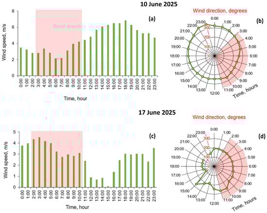 Meteorological conditions for the days of the strikes were obtained from the database of the Central Geophysical Observatory named after Borys Sreznevskyi (http://cgo-sreznevskyi.kyiv.ua/ (accessed on 4 August 2025)). No precipitation was recorded during either episode. On 10 June, the air temperature ranged from 13.4 to 20.6 °C, while on 17 June it varied between 15.3 and 30.0 °C. Wind speeds on both days remained below 5 m/s. Wind direction shifted from northwest to west during the first episode and remained predominantly southwest during the second (Figure 6).