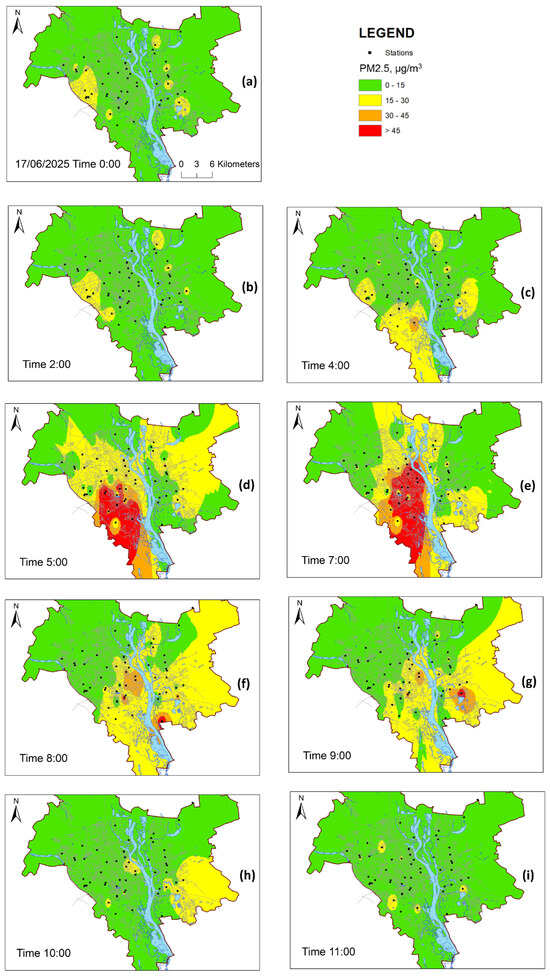 Time-slice maps of PM2.5 concentrations following the 10 June 2025 air strike, recorded at: (a) 3:00; (b) 4:00; (c) 5:00; (d) 6:00; (e) 7:00; (f) 8:00; (g) 9:00; (h) 10:00; (i) 11:00.