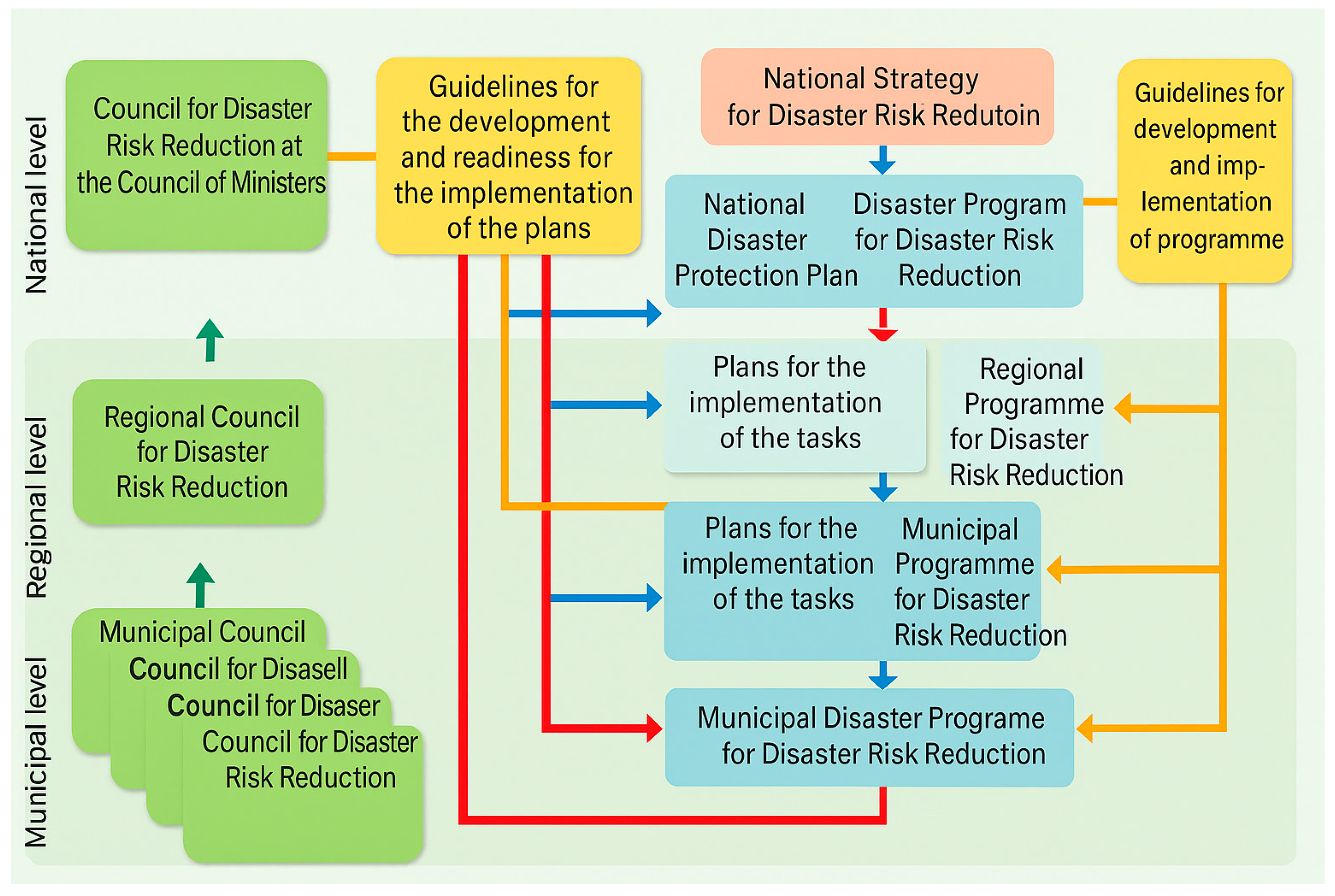 Figure 1), with each level responsible for developing plans that include separate sections for the hazards relevant to the territory, while the municipal mayor, the regional governor, and the Council of Ministers manage and coordinate the implementation of the respective plans—a system that was defined in many other strategic documents [